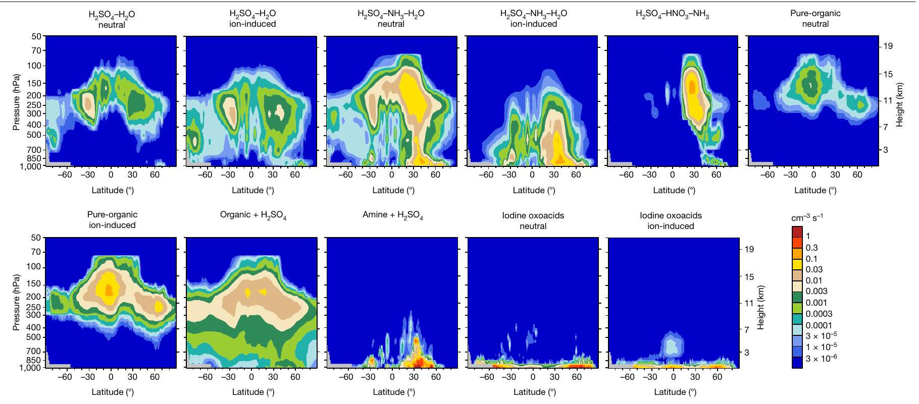 هنا قمنا بتجميع تجارب مختبرية على المستوى الجزيئي لتطوير تمثيلات نموذجية شاملة لتكوين الجسيمات الجديدة (NPF) والتحول الكيميائي لغازات السلف. يأخذ النموذج في الاعتبار 11 آلية نواة، من بينها أربع آليات حاسمة تم تجاهلها إلى حد كبير سابقًا، بما في ذلك نواة الأحماض الأكسجينية لليود المحايدة والمحفزة بالأيونات، والتآزر.