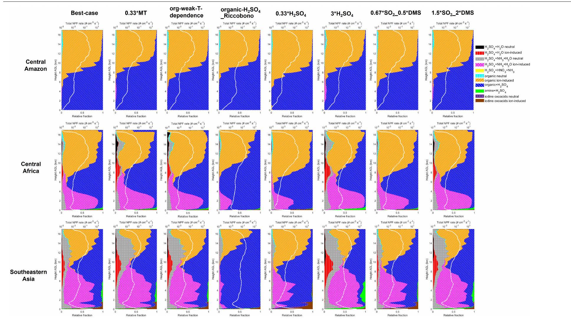 تركيزات لأنها لن تتحدى الأدوار الرائدة للتكوين الذي يتم بوساطة المواد العضوية فوق المناطق المعنية. تُظهر البيانات الموسعة الأشكال 5 و7 و8 أنه، حتى مع تقليل انبعاثات المونوتربين، لا يزال التكوين الذي يتم بوساطة المواد العضوية هو أكبر آلية لتكوين الجسيمات الجديدة في الطبقة العليا من الغلاف الجوي فوق المناطق الثلاث للغابات المطيرة وواحدة من الآليتين الرئيسيتين في الطبقة العليا من الغلاف الجوي فوق المحيطين الهادئ والأطلسي.