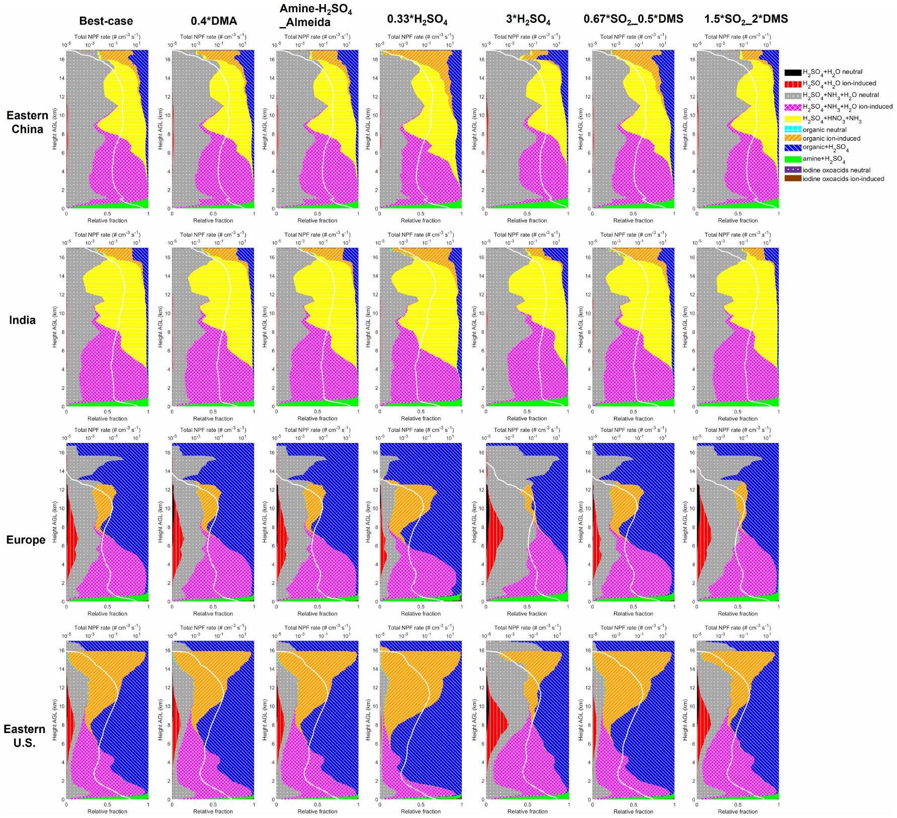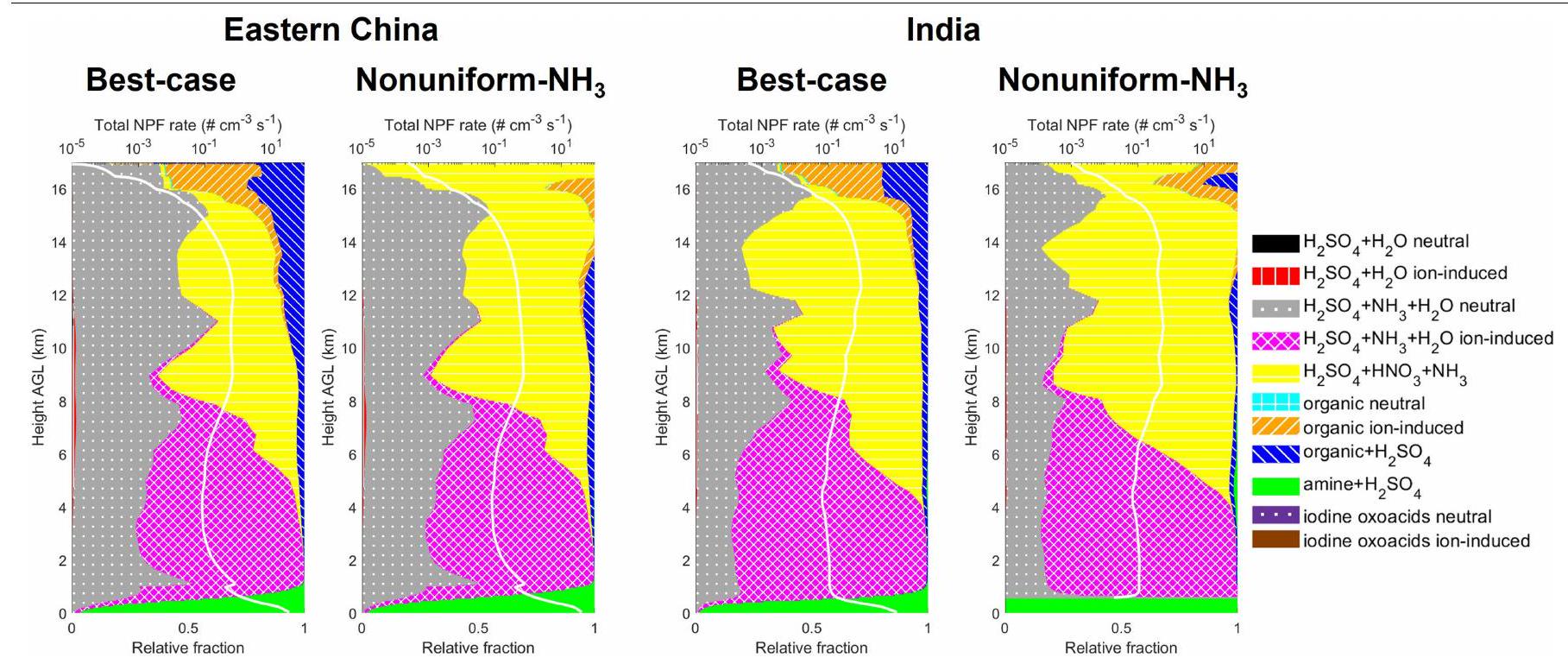التقاط شكل توزيع حجم الأعداد الدقيقة للغاية لأن النموذج يستخدم نهج الوضع لتمثيل حجم الجسيمات. ب، معدلات تكوين الجسيمات الجديدة كدالة للارتفاع فوق مستوى سطح البحر في شرق الصين والهند وأوروبا والشرق الأمريكي. تمثل الخطوط البيضاء إجمالي معدلات تكوين الجسيمات الجديدة عند قطر