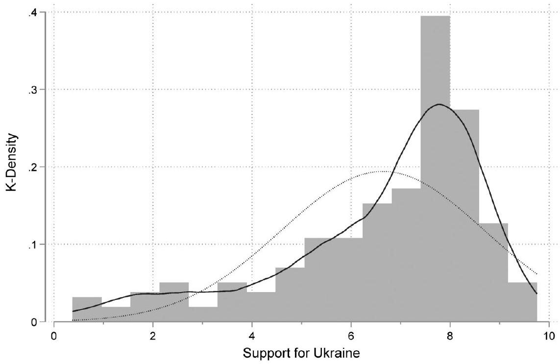 Note: We plot the distribution of support among 269 parties for each of four policies with respect to Ukraine. The distributions are kernel Epanechnikov with bandwidth held constant at 0.5 . Higher values on the