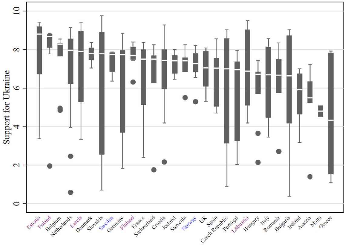 ملاحظة: نرسم الدعم لأوكرانيا في كل من 29 دولة باستخدام مخططات الصندوق على مقياس من 0 إلى 10، مرتبة من اليسار إلى اليمين، من أعلى إلى أدنى دعم وسطي لأوكرانيا. الدول باللون الأزرق لها حدود مشتركة مع روسيا، والدول باللون الأرجواني تم احتلالها وضمها جزئيًا أو كليًا من قبل الاتحاد السوفيتي في الحرب العالمية الثانية (جميعها تشترك أيضًا في حدود مع روسيا). تمثل القيم الأعلى على المحور