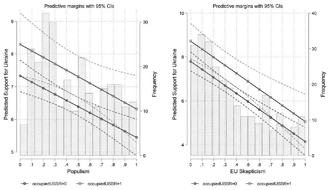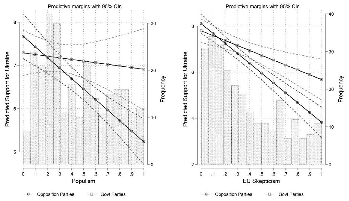 Note: This figure compares the predicted support for Ukraine among opposition parties and government parties at different levels of populism (left panel) or different levels of EU-skepticism (right panel) with histograms of the independent variables to display the distribution of populism and EU-skepticism. The slopes plot the relationship, under controls, between populism (EU-skepticism) and support for Ukraine, within
