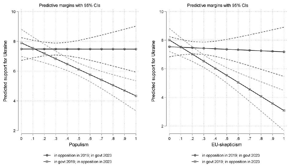 Note: This figure compares the predicted support for Ukraine among (a) parties that transitioned from opposition in 2019 to government in 2023; and (b) parties that transitioned from government in 2019 to opposition in 2023 at different levels of populism (left panel) or EU-skepticism (right panel). The slopes plot the relationship, under controls, between populism (EU-skepticism) and support for Ukraine, within
