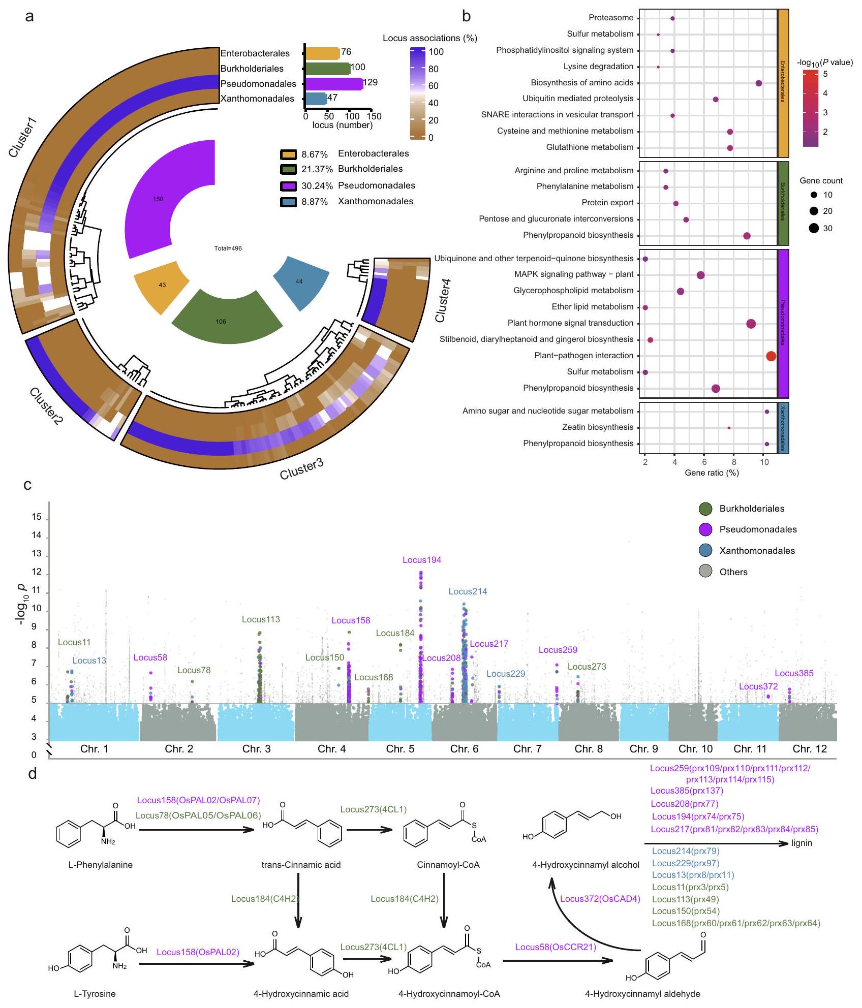 لذلك قمنا بمزيد من التحقيق في الجينات المرتبطة بـ Burkholderiales و Pseudomonadales و Xanthomonadales التي كانت غنية في مسار تخليق الفينيل بروبانيد (الشكل 2c، d). وجدنا أن الغالبية العظمى من جينات prx (البيروكسيداز)، التي تشارك في تخليق اللجنين، كانت مرتبطة بـ Burkholderiales و Pseudomonadales و Xanthomonadales (الشكل 2d، البيانات التكميلية 4). بالإضافة إلى ذلك، تم العثور على جينات 4CL1 (4-كومارات-CoA ليغاز، Os08g0245200) و C4H2 (سينامات-4-هيدروكسيلاز، Os05g0320700)، التي تشارك في تخليق سينامويل-CoA و 4-هيدروكسي سينامويل-CoA، على التوالي، مرتبطة بشكل خاص بـ Burkholderiales. من ناحية أخرى، كانت جينات OsPALO2 (أميناز الفينيل ألانين/التيروزين، Os04g0518100) و OsCAD4 (كحول سيناميل ديهيدروجيناز، Os11g0622800) و OsCCR21 (اختزال سينامويل-CoA، Os02g0180700)، التي تشارك في تخليق 4-هيدروكسي حمض السيناميك و 4-هيدروكسي كحول السيناميل و 4-هيدروكسي ألدهيد السيناميل، على التوالي، مرتبطة بشكل خاص بـ Pseudomonadales (الشكل 2d، البيانات التكميلية 4). وهذا يشير إلى اختلافات محتملة في التحكم الجيني للمضيف في الميكروبيوم الفيلوسفير. بشكل جماعي، اقترحت تحليلاتنا أن المركبات التي هي جزء من تخليق اللجنين أو سلفها قد تشارك في تنظيم تجميع الميكروبيوم، والأهم من ذلك، أن بعض المركبات قد تؤثر على أنواع بكتيرية معينة.