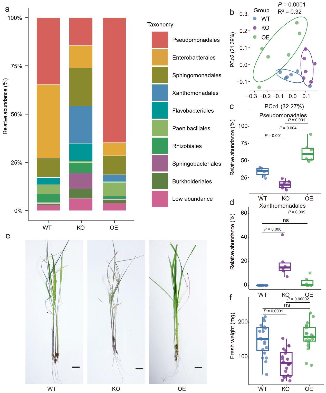 Fig. 3 | OsPALO2 is linked to phyllosphere microbiome assembly and has implications for plant health. a Bacterial communities at order level in WT (wildtype, ZH11 rice variety), KO (OsPALO2-knockout) and OE (OsPALO2-overexpression) plants. Unconstrained PCoA based on Bray-Curtis distances showing bacterial community clustering in WT, KO and OE plants ( -value was calculated by one-way PERMANOVA). Ellipses cover of the data for each group. Comparison of relative abundances of Pseudomonadales (c) and Xanthomonadales (d) in WT, KO and OE phyllosphere microbiomes. The numbers of