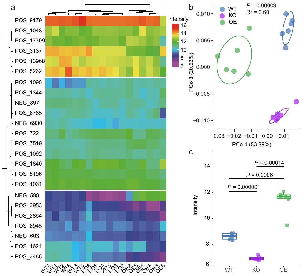 Fig. 4 | Metabolite profiles of OSPALO2 mutants. a Heatmap based on intensity values of detected cinnamic acid and derivatives in different rice leaves. Clusters are shown on the left and top using Bray-Curtis distances. All cinnamic acid labels (left) are shown in Supplementary Data 6. Rice sample labels (bottom) are as follows: WT1/2/3/4/5/6 (wild-type 1/2/3/4/5/6), KO1/2/3/4/5/6 (OsPALO2-KO 1/2/3/4/5/6), OE1/2/3/4/5/6 (OsPALO2-OE 1/2/3/4/5/6). b Unconstrained PCoA based on BrayCurtis distances showing leaf metabolite separation for WT, KO and OE plants ( -values were calculated with one-way by PERMANOVA). Ellipses cover of the data for each group. Blue, purple and green colors