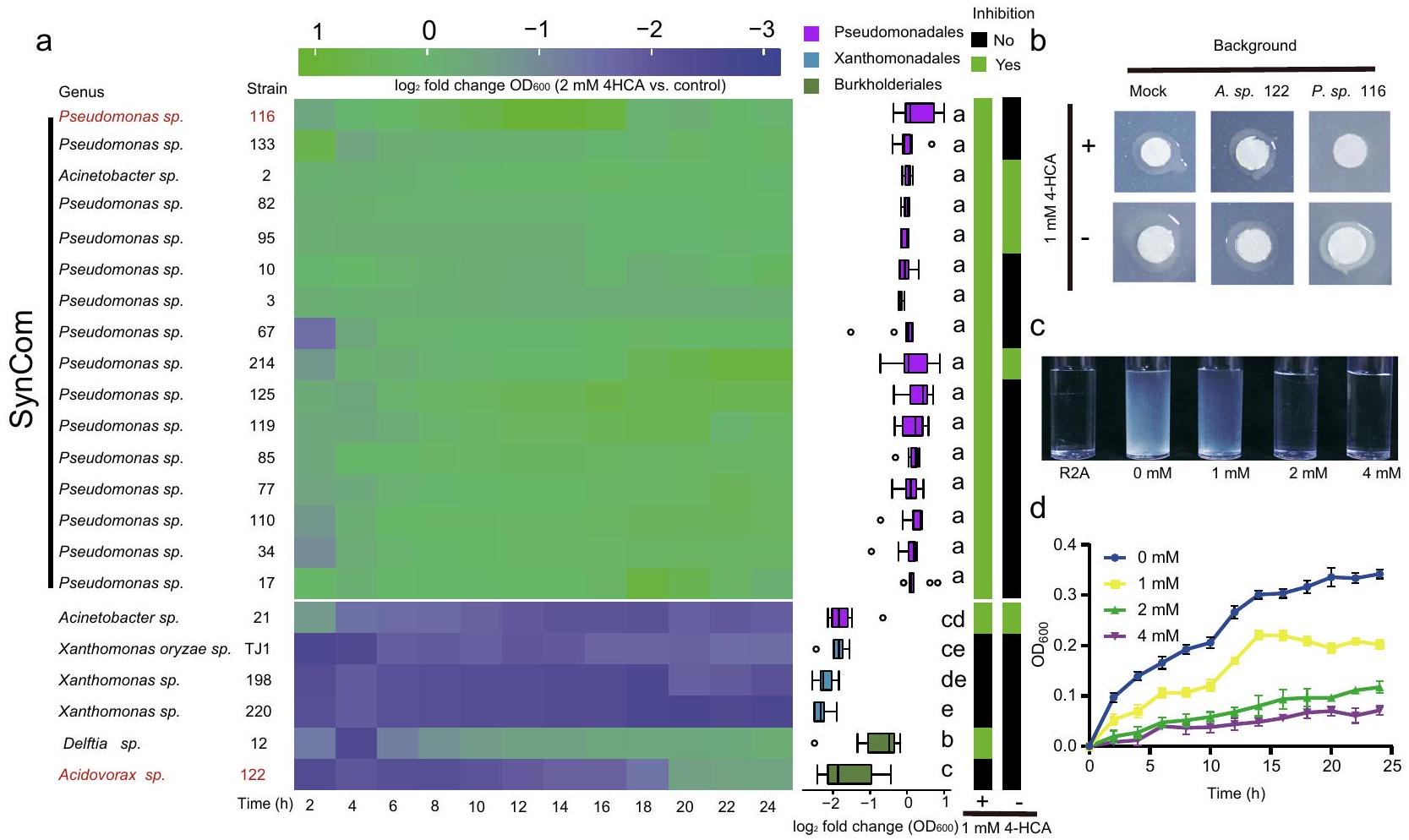 بعد ذلك، قمنا بإجراء تجارب في المختبر لاختبار تأثير 4-HCA على سلالات من Pseudomonadales وXanthomonadales وBurkholderiales. تم زراعة هذه السلالات البكتيرية في وسط سائل R2A مضاف إليه; نفس التركيز أعاق نمو الممرض TJ1. وجدنا أن معظم سلالات Pseudomonadales نمت بشكل أسرع في وجود بينما تم تثبيط جميع سلالات Xanthomonadales و Burkholderiales بشكل ملحوظ (الشكل 5a). تحليل مفصل لتغيرات النمو ( ) أظهرت أن جميع سلالات Pseudomonadales، باستثناء Acinetobacter sp. 21، أظهرت معدل نمو أعلى بشكل ملحوظ من سلالات Xanthomonadales و Burkholderiales في وجود 2 مللي مول من 4-HCA (الشكل 5a، الشكل التوضيحي 18، البيانات التكميلية 7). أوضحت التجارب في المختبر تأثير