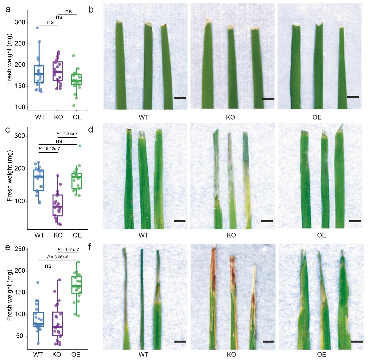 replicated samples in are as follows: WT ( ), KO ( ) and OE ( ). Representative images of typical phenotype traits (e) and fresh weight (f) between WT, KO and OE rice plants. The numbers of replicated samples are as follows: WT ( ), KO ( ) and OE ( ). Scale bar, 1 cm . In this figure, box plot percentiles are the same as in Fig. 1b. The -values were calculated with unpaired one-way ANOVA with Tukey’s HSD test ( ). The labels ‘ns’ indicate a not significant difference ( ). Source data are provided as a Source Data file.