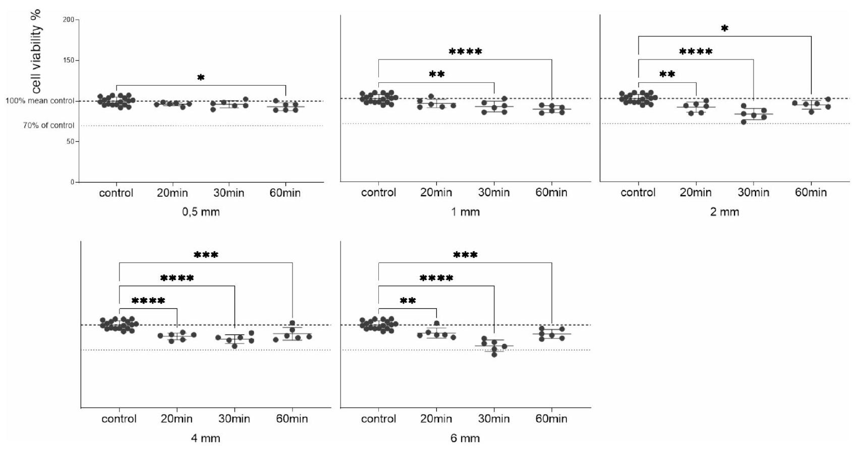 سمكات، مع العينات بسمك 2 و4 و6 مم تظهر أكبر فقدان في حيوية الخلايا عند المعالجة لمدة 30 دقيقة. ومع ذلك، أظهرت المعالجة لمدة 60 دقيقة زيادة لاحقة في حيوية الخلايا.