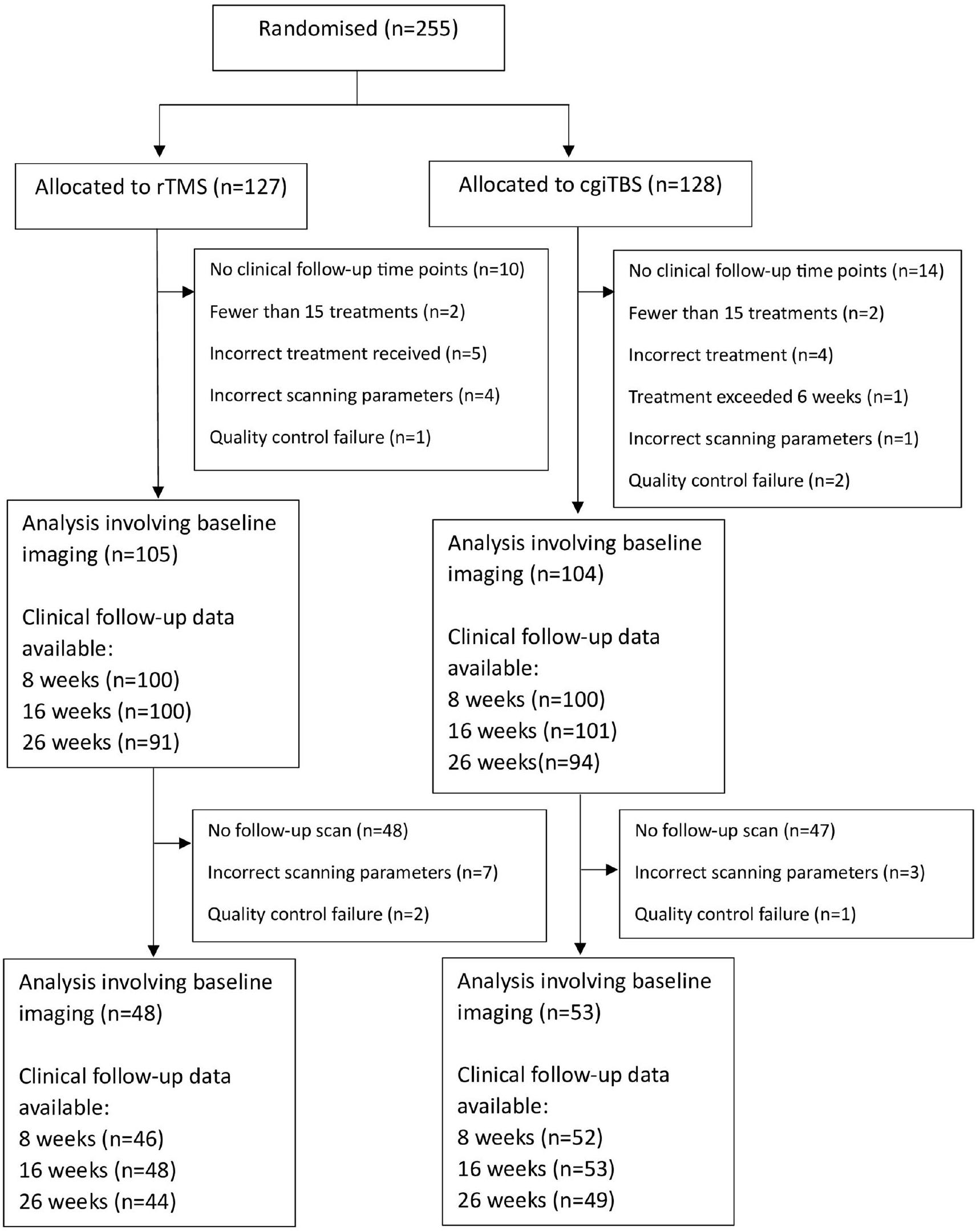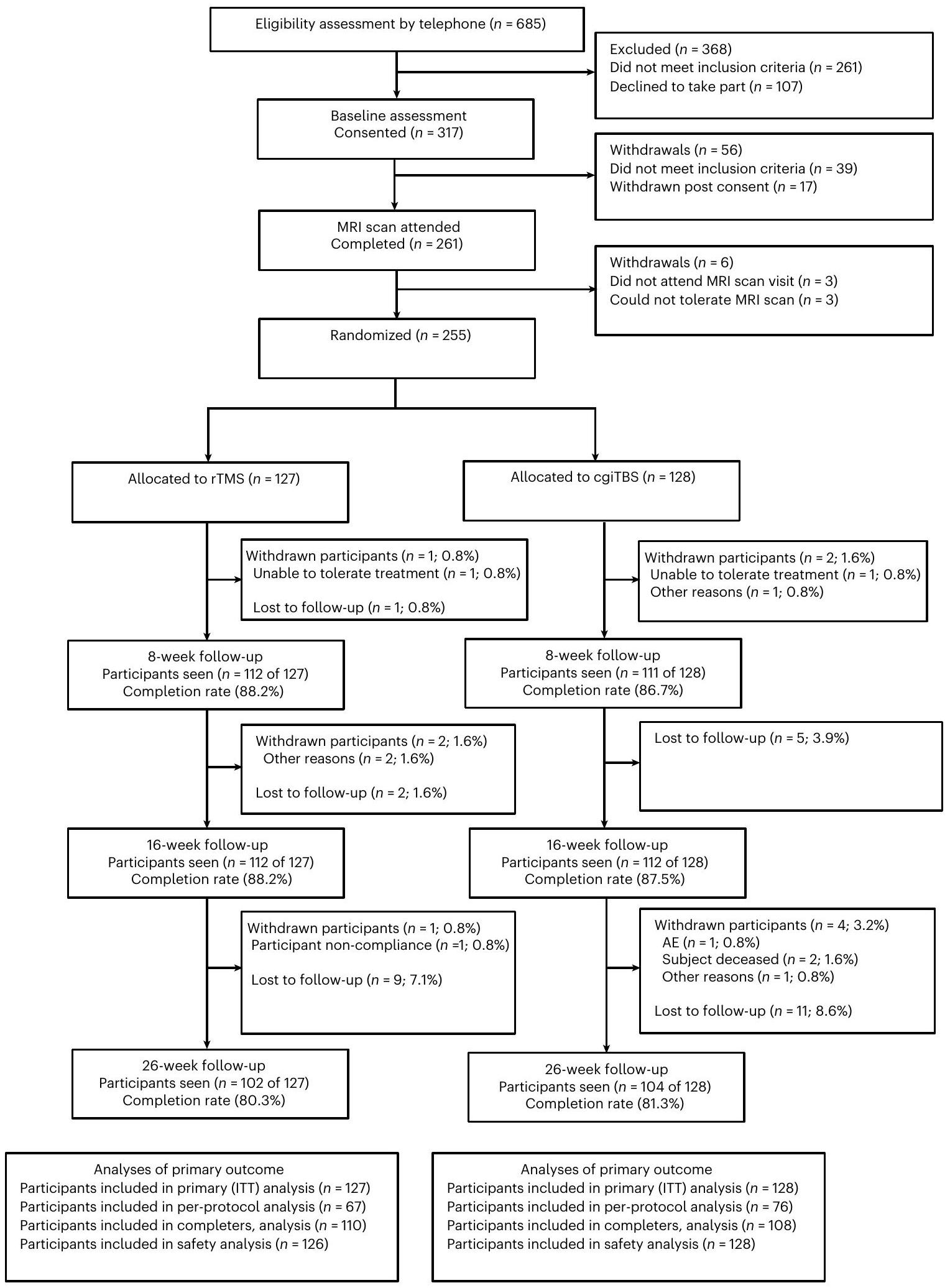 بين 22 يناير 2019 و31 يناير 2022، تم تحديد 685 فردًا وأكملوا الفحص الأولي للهاتف لتحديد الأهلية لتجربة BRIGhTMIND (الشكل 1). تم تعليق التوظيف في الدراسة مؤقتًا بين 30 أبريل و1 أغسطس 2020 بسبب جائحة COVID-19. وافق ما مجموعه 317 مشاركًا على التجربة، حيث لم يستوفِ 39 منهم معايير الإدراج وانسحب 23 بين خط الأساس والتوزيع العشوائي. تم توزيع 255 مشاركًا بشكل عشوائي، 127 إلى rTMS و128 إلى cgiTBS، مع تضمين جميع المشاركين الذين تم توزيعهم عشوائيًا في مجموعة النية للعلاج (ITT). في المجموع، أكمل 235 مشاركًا جميع جلسات TMS الـ 20 (92.8٪؛ حيث انسحب مشاركان من كل من مجموعتي rTMS وcgiTBS من التجربة تمامًا خلال العلاج). كما وُجدت معدلات إكمال مماثلة لـ rTMS مقابل cgiTBS بعد 8 أسابيع (rTMS، 112 منضد cgiTBS، 111 من ، 16 أسبوعًا (rTMS، 112 من ضد cgiTBS، 112 من ) و 26 أسبوعًا (rTMS، 102 من مقابل cgiTBS، 104 من ). تم الانتهاء من التقييم النهائي للمتابعة في 3 أغسطس 2022. وفقًا لخطة التحليل المنشورة مسبقًا بالنسبة لـ 255 مشاركًا أكملوا مسح الهيكل الأساسي ومسح rsfMRI وبدؤوا العلاج بالتحفيز المغناطيسي عبر الجمجمة، كان هناك 209 ( ) تم تضمينها في تحليل الصورة. من بين 114 مشاركًا أكملوا مسح الخط الأساسي ومسح المتابعة بعد 16 أسبوعًا، كان 101 ( تم تحليلها (الشكل البياني الموسع 1).