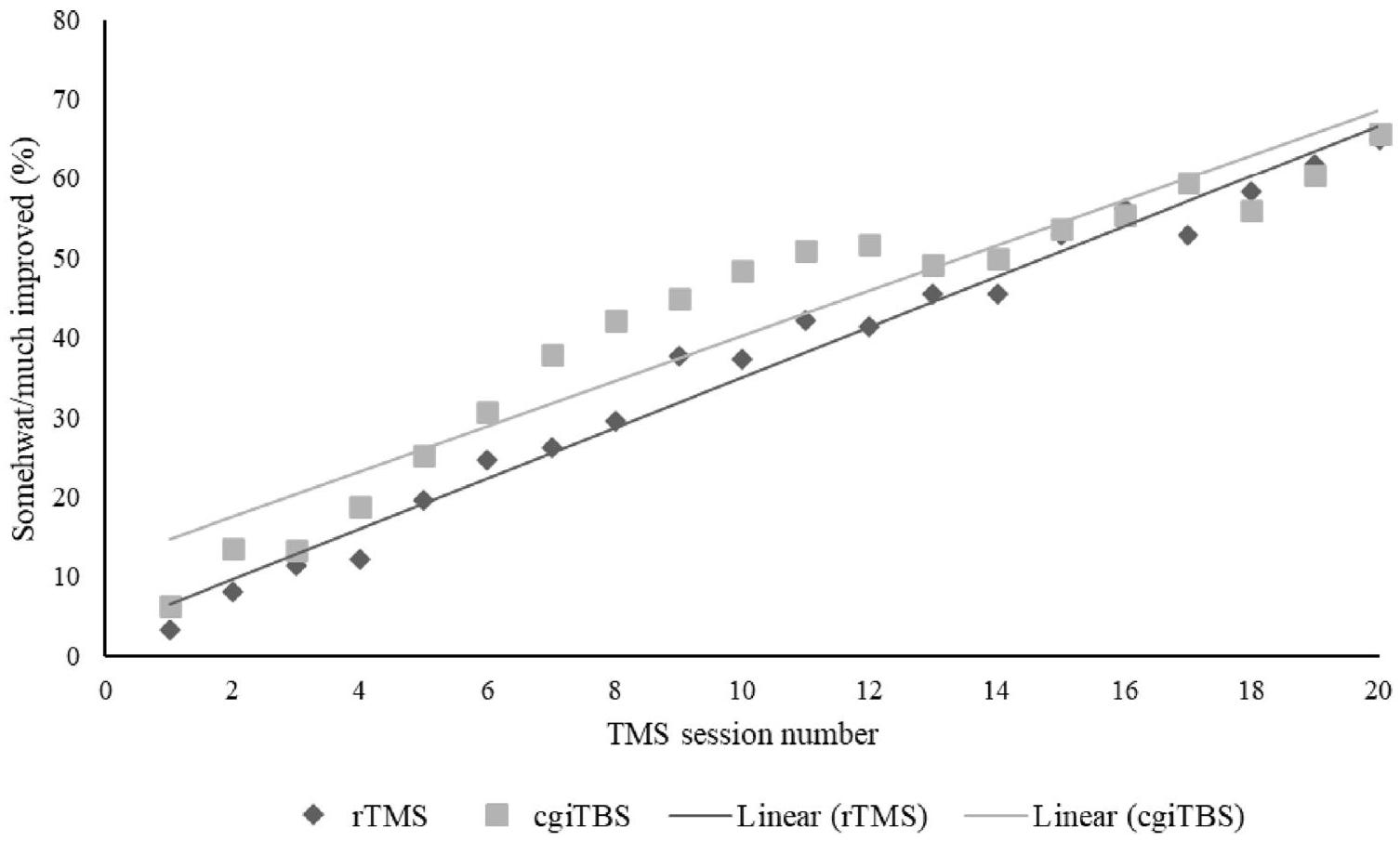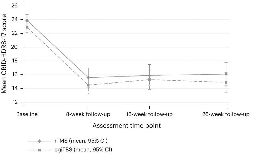 بعد 8 أسابيع من التوزيع العشوائي، أظهرت كلا مجموعتي العلاج انخفاضًا سريريًا كبيرًا ( (المرجع 26)، rTMS 8.3، cgiTBS 8.4) في متوسط درجات GRID-HDRS-17 التي تم الحفاظ عليها عند 16 أسبوعًا (rTMS 8.0، cgiTBS 7.6) و 26 أسبوعًا (rTMS 7.8، cgiTBS 8.0؛ الجداول 2 و 3 والشكل 2).