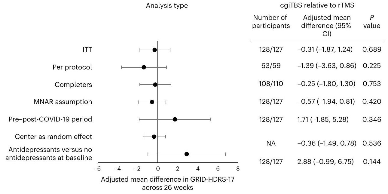 كما هو موضح في الجدولين 2 و 3، لم يكن الفرق المتوسط المعدل لـ GRID-HDRS-17 على مدى 26 أسبوعًا ذا دلالة إحصائية ولم يكن مهمًا سريريًا (فرق أقل من 3 نقاط) ) بين مجموعات علاج rTMS و cgiTBS للتحليل الأساسي ( -0.31 (95% إلى 1.24) ).