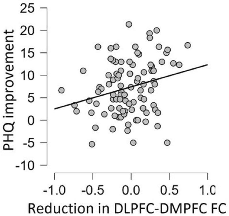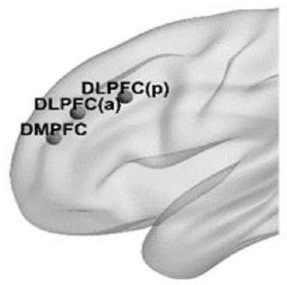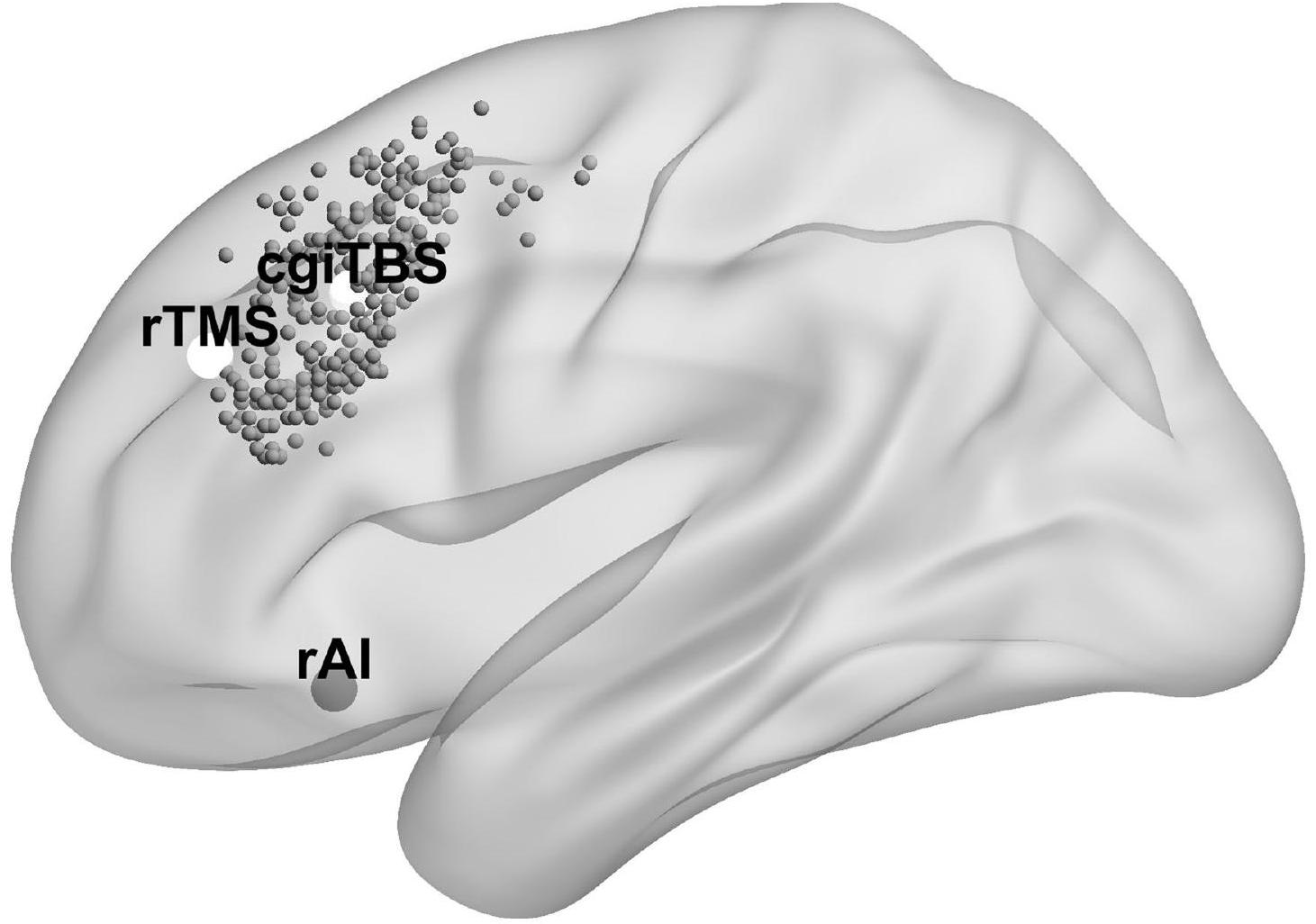 (موقع F3 من تسميات مواقع الأقطاب الكهربائية 10-20) لدى المرضى الذين يعانون من TRD. على الرغم من استخدام موقع قياسي لـ rTMS، تم تخصيص موقع ذلك الموقع F3 باستخدام تصوير الرنين المغناطيسي الهيكلي. كانت الفرضيات الميكانيكية الأساسية التي تستخدم fMRI هي: (1) الاتصال الفعال الأساسي من rAI إلى IDLPFC، أو أن توازن التأثير بين هاتين المنطقتين سيعدل، أو يرتبط، بتحسن في أعراض الاكتئاب على مدى 26 أسبوعًا؛ و(2) سيكون تقليل الاتصال الوظيفي بين IDLPFC والقشرة الجبهية الظهرية اليسرى (IDMPFC) مرتبطًا بتحسن في أعراض الاكتئاب كما وجد في كل من عملنا التجريبي ودراسة أخرى .