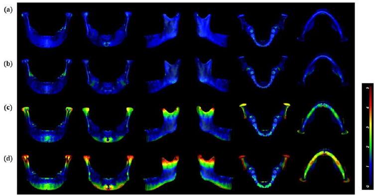 السطح الكامل للفك السفلي [4]. لم يتم اختيار ICP كطائرة مرجعية لأنه على الرغم من أن كلا الطريقتين تستخدمان قيمة الجذر التربيعي المتوسط، فإن خوارزمية ICP تحسب أقرب مسافة بين النموذج الأصلي ونموذج المرآة، بينما تحسب طريقة رسم الخرائط القالب المسافة بين النموذج الأصلي والمعالم شبه المطابقة في المرآة، مما له مزايا المزيد من النقاط، والذكاء، وعلاقات المطابقة الجيدة [9]. عندما كان الفك السفلي غير متماثل بشدة، انخفضت دقة خوارزمية ICP [4]. استخدمت العديد من الدراسات السابقة مستوى B-G-Me كـ MMSP لدراسة تماثل الفك السفلي [5، 6]. أظهرت نتائج الدراسة الحالية أن AI لمستوى B-G-Me كان 7.49 (الجدول 2)، والذي اختلف بشكل كبير عن النتائج التي تم الحصول عليها لمستوى