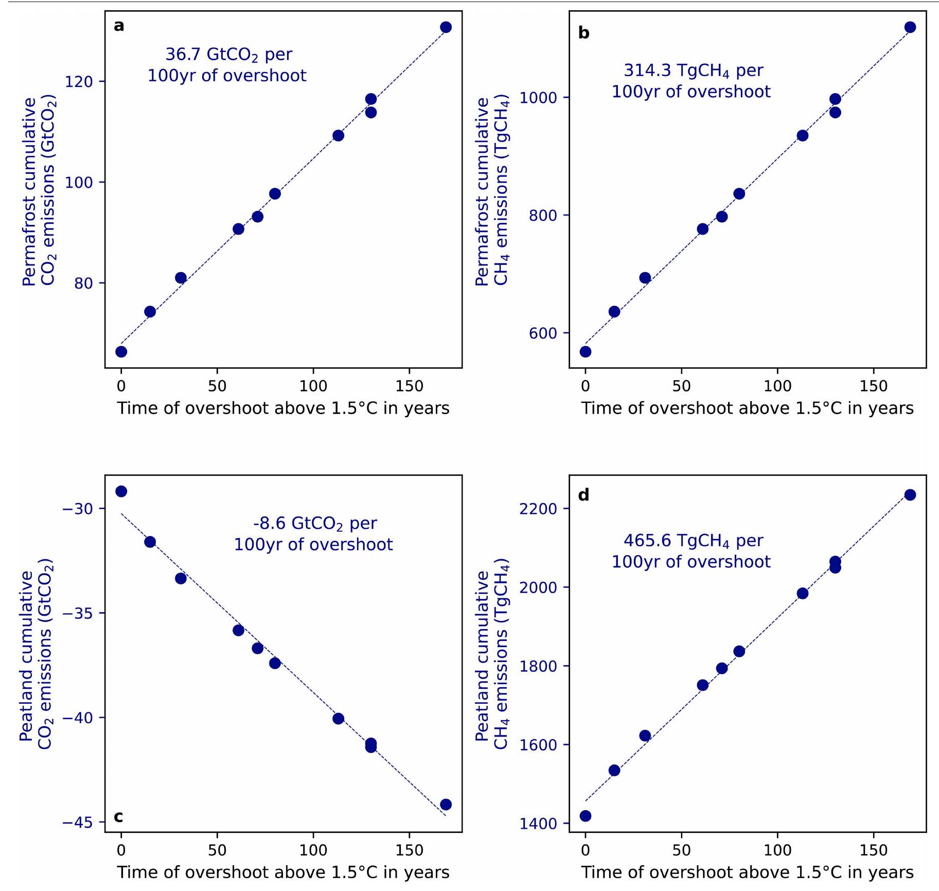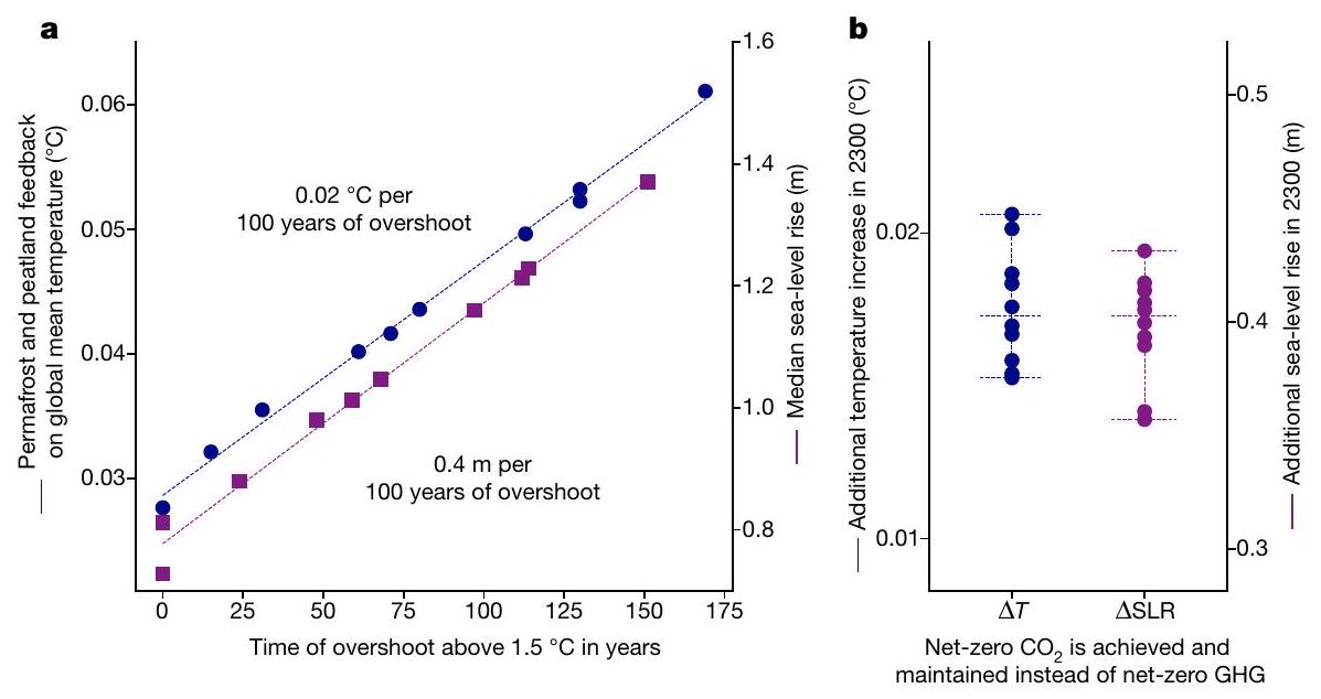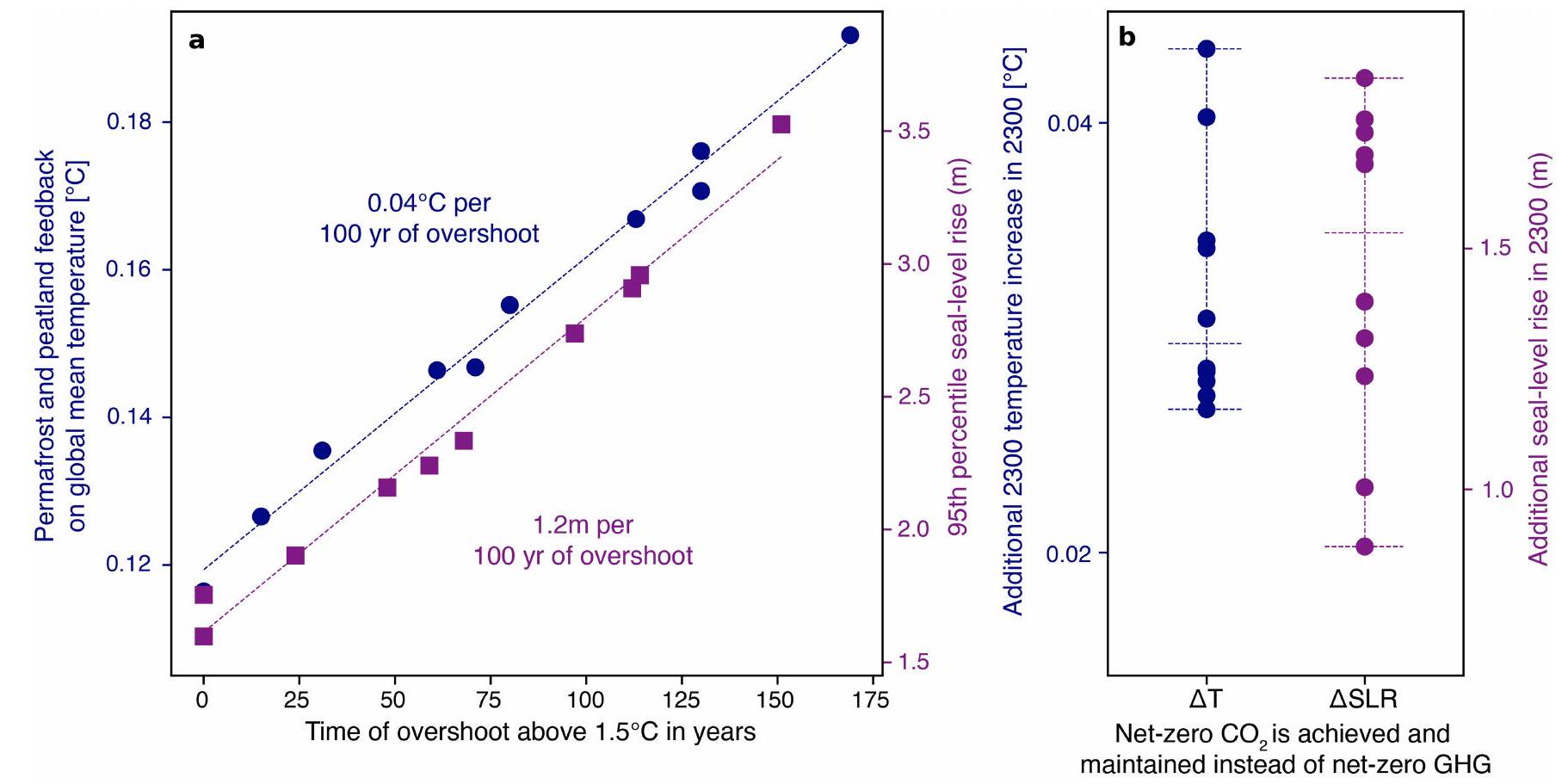 زيادة متوسط درجة الحرارة الناتجة عن انبعاثات التربة المتجمدة والأراضي الخثية بسبب الاحترار وارتفاع مستوى سطح البحر الناتج عن تثبيت درجات الحرارة عند ذروة الاحترار (تحقيق والحفاظ على صافي انبعاثات صفرية