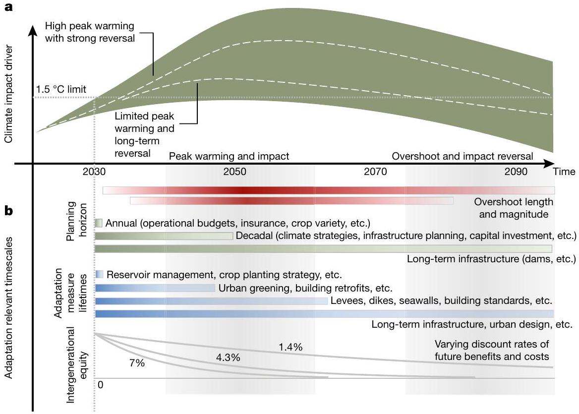 حتى تحت الافتراض المتفائل بوجود قابلية عكسية شبه كاملة لمؤثرات المناخ تحت تجاوز الحدود، قد يتطلب الأمر أفق تخطيط يمتد إلى 50 عامًا أو أكثر قبل أن تبدأ آفاق الانخفاض على المدى الطويل في التأثير على قرارات التكيف اليوم أو في المستقبل القريب (الشكل 5أ). القليل من خطط وسياسات التكيف تعمل على هذه الأطر الزمنية: على سبيل المثال، تمتد استراتيجية التكيف الخاصة بالاتحاد الأوروبي على مدى ثلاثة عقود، في حين أن خطط التكيف الوطنية الأخرى لها آفاق زمنية مماثلة أو أقصر.