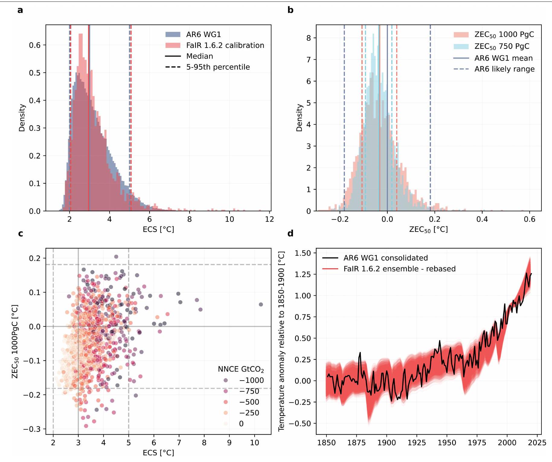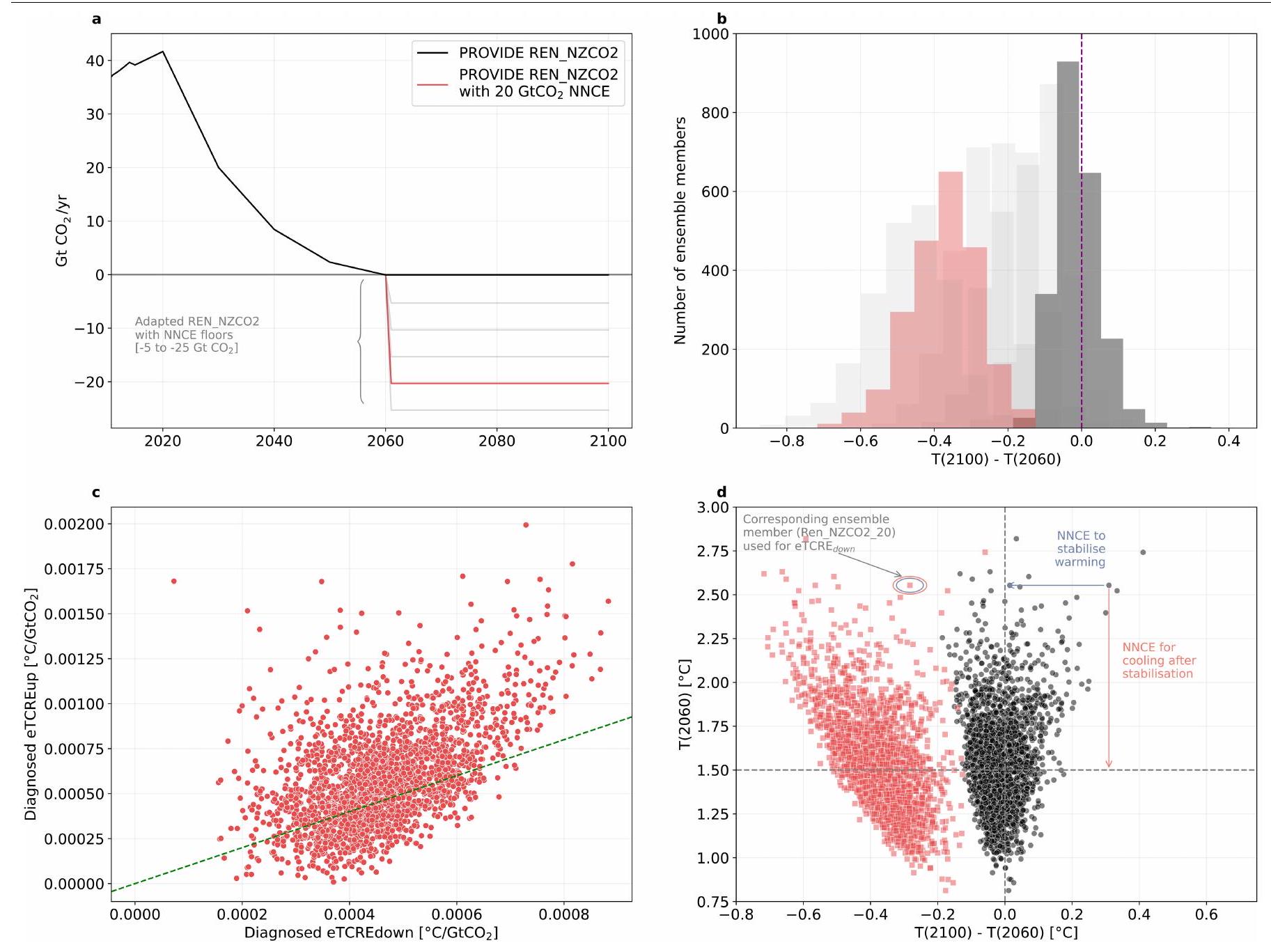 we cannot rule out high ECS/ZEC ensemble members that drive the tail of our NNCE distribution (Extended Data Fig. 2c). Yet, we find high NNCE outcomes also materialize for moderate-high ECS and ZEC outcomes.