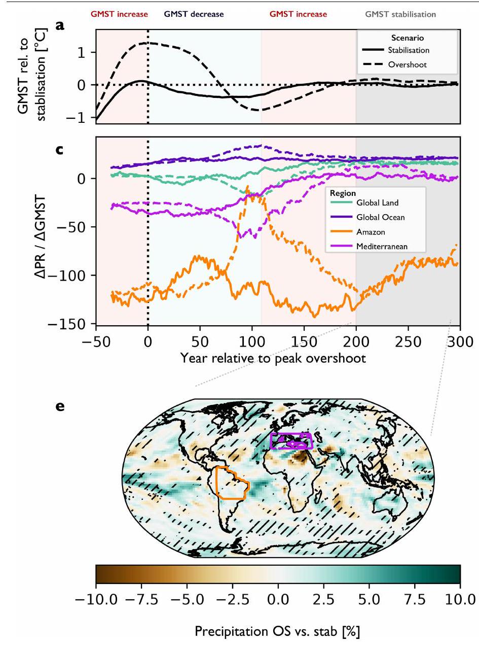 region (31-year averaged anomalies relative to 1850-1900). e,f regional differences in annual precipitation between overshoot and stabilisation scenarios over hundred years of long-term GMT stabilisation (grey shaded area in panels