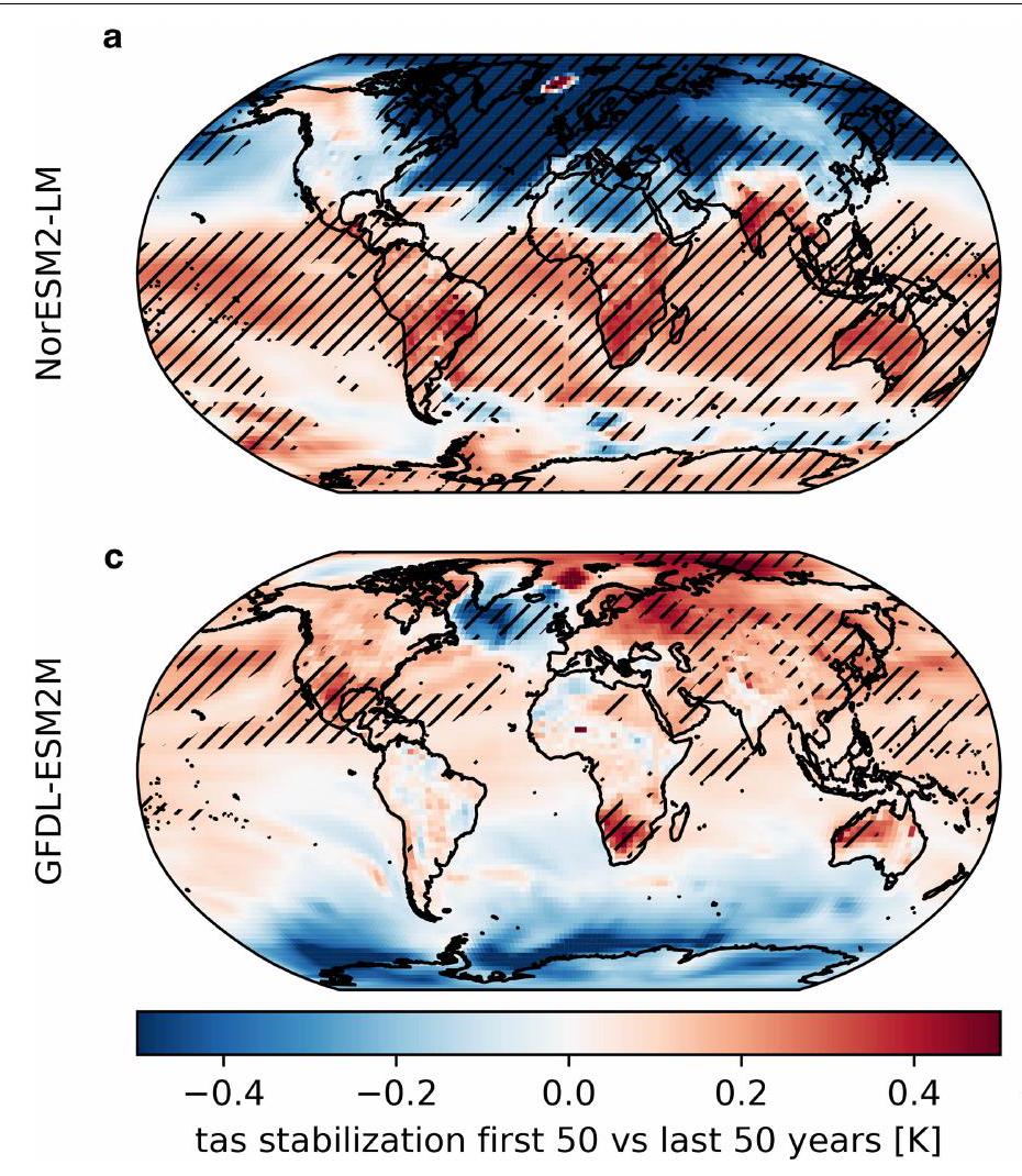 scenario. a,b show results for NorESM, c,d for GFDL-ESM2M, a,c for annual temperature over the first 50 years of GMT stabilisation vs. the last 50 years (compare Fig. 3a). Negative values mean the first period is cooler than the