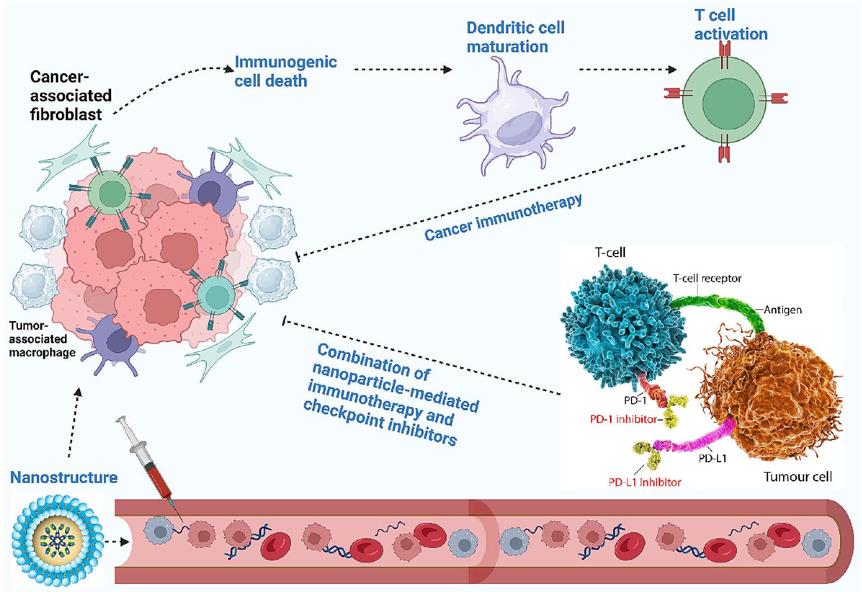 الشكل 1 نظرة عامة على استخدام الجسيمات النانوية في العلاج المناعي للسرطان. تتداول الجسيمات النانوية في الدم، وعند وصولها إلى موقع الورم، تعيد تعليم عدة مكونات من البيئة الدقيقة للورم، بما في ذلك الألياف المرتبطة بالسرطان والبلعميات المرتبطة بالورم، لتنشيط النظام المناعي في النهاية. علاوة على ذلك، يمكن أن تحفز الجسيمات النانوية موت الخلايا المناعية لتحسين نضوج الخلايا الشجرية لتنشيط خلايا المناعة، مثل خلايا T، لتعزيز العلاج المناعي للسرطان. يمكن أن يزيد التطبيق المشترك للجسيمات النانوية مع مثبطات نقاط التفتيش المناعية، مثل مثبطات PD-L1، من إمكانيات العلاج المناعي للسرطان