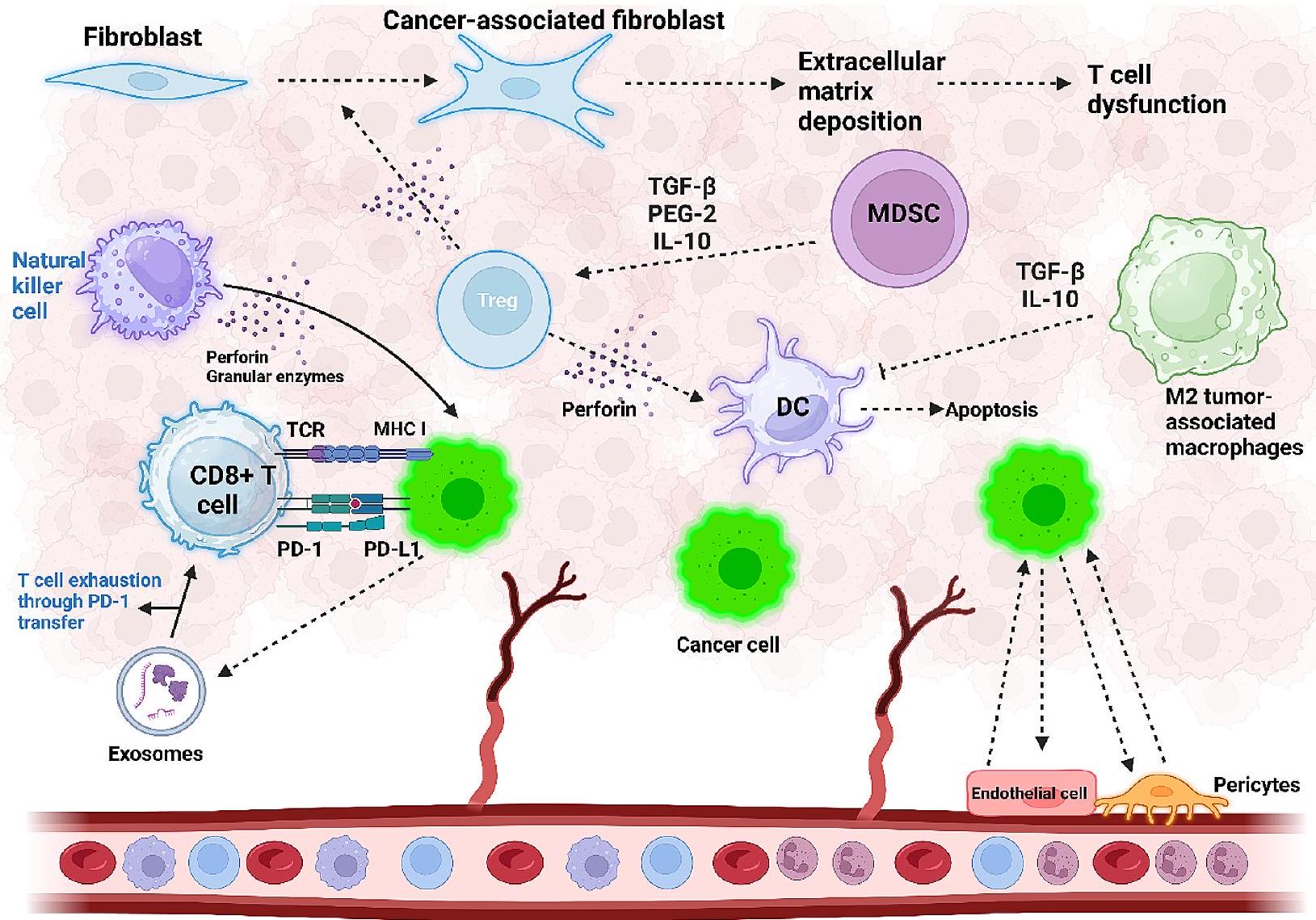 الشكل 2 المكونات الخلوية التي تؤثر على بيئة الورم الدقيقة (TME). تلعب التفاعلات داخل TME دورًا حاسمًا في تسريع تقدم السرطان. تقوم خلايا السرطان بتنشيط محور PD-L1/PD-1، مما يؤدي إلى استنفاد خلايا T وضعف وظيفة خلايا T. بالإضافة إلى ذلك، تساهم الإكسوزومات التي تفرزها خلايا السرطان وتحمل PD-1 في خلل وظيفة خلايا T، مما يقلل من التكاثر ويعيق الوظيفة السليمة. تتصدى خلايا القاتل الطبيعي لتكون الورم من خلال إفراز البيرفورين والإنزيمات الحبيبية. يؤدي زيادة تسلل خلايا Treg في TME إلى إفراز TGF-، مما يؤدي إلى تحويل الخلايا الليفية إلى الخلايا الليفية المرتبطة بالسرطان (CAFs)، وتعزيز ترسيب المصفوفة خارج الخلية، والتسبب في خلل وظيفة خلايا T. تقوم خلايا المثبطة المشتقة من النخاع (MDSCs) بتحفيز تكوين خلايا Treg في بيئة الورم من خلال إفراز PGE-2 و IL-10 و TGF-تقوم خلايا T التنظيمية (Treg) بدورها بقمع وظيفة الخلايا الشجرية (DCs) عن طريق إفراز البيرفورين، مما يؤدي إلى موت خلايا DC. تقوم البلعميات المستقطبة من النوع M2 بإفراز TGF-و IL-10، مما يعطل وظيفة خلايا DC. التفاعل بين الخلايا البطانية وخلايا السرطان يؤدي إلى تكوين الأوعية الدموية، مما يعزز تقدم السرطان بشكل أكبر (تم إنشاؤه بواسطة Biorender.com)