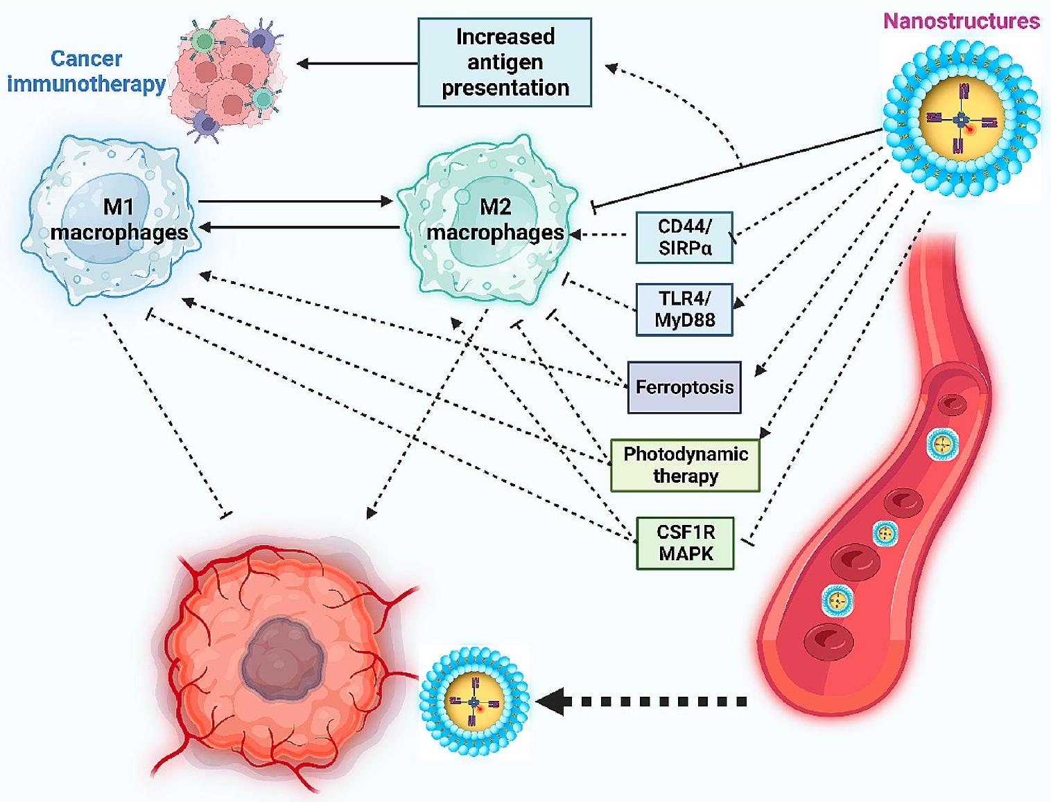استهداف البلعميات في علاج السرطان مدفوع أساسًا بوظيفتها المثبطة للمناعة. على الرغم من تطوير استراتيجيات مختلفة لتنظيم الاستجابة المناعية، مثل العلاج المناعي المستحث بالضوء، لا تزال المخاوف قائمة بشأن المناعية وتحفيز الالتهاب. لذلك، من الضروري أن تستخدم الجسيمات النانوية آليات آمنة ومتوافقة حيويًا لمواجهة تثبيط المناعة الذي تسببه البلعميات. -هياكل نانوية من نوع SAS@PLT، مشتقة من هياكل نانوية مغناطيسية مسامية محملة بالسلفاسالازين ومفعلّة بالصفيحات، تم تصميمها لقمع نظام ناقل الجلوتامات-سيستين Xc-pathway في تحفيز الفيروبتوز. يظهر هذا التحفيز للفيروبتوز تأثيرات تآزرية مع العلاج المناعي لنقطة التفتيش PD-L1، كما لوحظ في نماذج حيوانية. ومن الجدير بالذكر أن هذه الهياكل النانوية البيوميميتية تحفز الفيروبتوز، مما يعزز استقطاب M1 للبلاعم ويعطل البيئة المجهرية المثبطة للمناعة [252].
