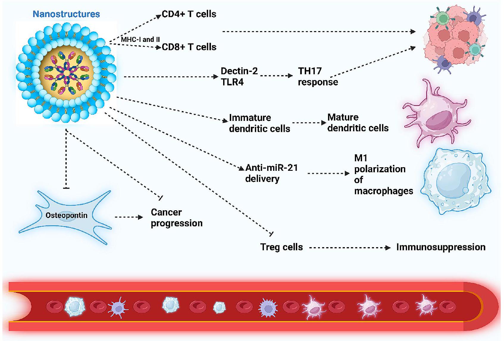 بالإضافة إلى مقاومة المناعة، تفتقر الأدوية الحالية المستخدمة في علاج السرطان المناعي وإعادة تشكيل بيئة الورم إلى ميزات الاستهداف. ونتيجة لذلك، تم تقديم الجسيمات النانوية لتسهيل المناعة المضادة للسرطان. يمكن أن تحسن الهياكل النانوية من وقت الاحتفاظ وتوفر التوصيل المستهدف. علاوة على ذلك، فإن الجسيمات النانوية قادرة على إعادة تشكيل بيئة الورم لتعطيل البيئة المثبطة للمناعة. إن تشوه الأوعية الدموية ومعدل النمو المرتفع لخلايا الورم يسبب نقص الأكسجين في بيئة الورم، مما يؤدي إلى بيئة مثبطة للمناعة، تتميز بزيادة تراكم الخلايا المثبطة للمناعة، بما في ذلك خلايا T التنظيمية (Tregs) وخلايا المثبطات المشتقة من النخاع (MDSCs)، بالإضافة إلى إفراز عدد من العوامل بما في ذلك عامل نمو بطانة الأوعية الدموية (VEGF) وعامل النمو المحول. (TGF- ). نتيجة لذلك، يتم قمع وظيفة الخلايا الشجرية ويتم استقطاب البلعميات إلى نمط M2. يمكن تطوير الجسيمات النانوية بشكل خاص لاستهداف مكونات البيئة الدقيقة للورم وتعطيل البيئة المناعية المثبطة لتحسين الوظيفة في العلاج المناعي للسرطان. علاوة على ذلك، يمكن اعتبار الجسيمات النانوية أنظمة توصيل على مقياس النانو للأدوية [50]. يمكن أن تتراكم بشكل انتقائي في أنسجة الورم وتعزز وقت الاحتفاظ بالأدوية. علاوة على ذلك، تظهر الهياكل النانوية تحسينًا