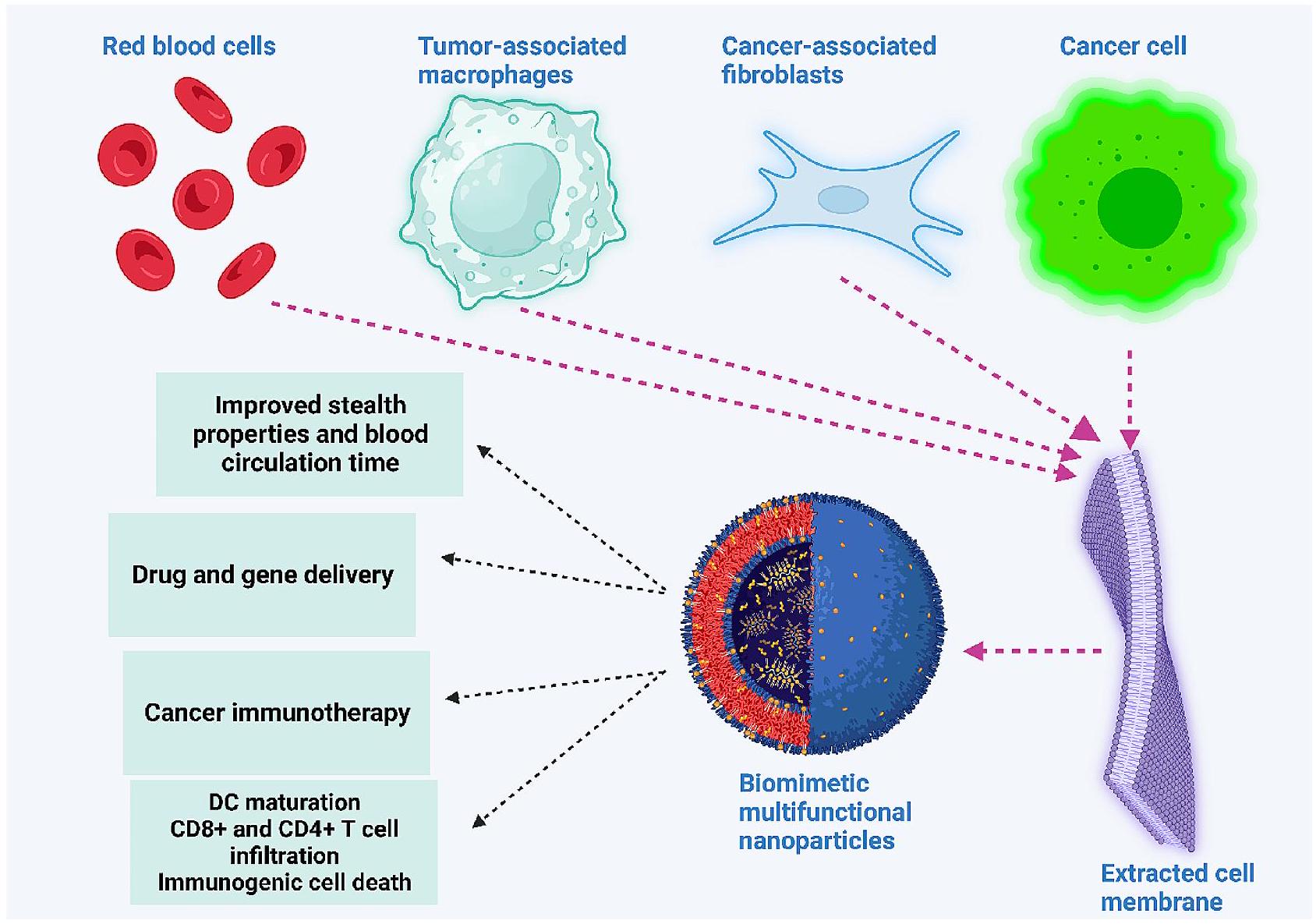 يمكن أن تعمل الجسيمات النانوية بوظائف مزدوجة في تنظيم الخلايا الليفية السرطانية وتعديل الاستجابات المناعية. الجسيمات النانوية من حمض البولي (لاكتيد-كو-جليكوليد) (PLGA) المجهزة بغشاء الخلايا السرطانية لم تعزز فقط تفاعلات الخلايا السرطانية مع الخلايا الليفية السرطانية، بل زادت أيضًا من امتصاص المستضد، مما يحفز و تعمل خلايا T من خلال MHC-I وMHC-II، مما يعزز العلاج المناعي للسرطان [279]. يمثل بروتين تنشيط الألياف، الذي يتم تنظيمه بشكل زائد على أسطح خلايا الألياف السرطانية، هدفًا واعدًا في العلاج المناعي للسرطان. كانت الجسيمات النانوية المجهزة بشظية متغيرة أحادية السلسلة لتوصيل ZnF16Pc في العلاج الضوئي للسرطان تفتقر إلى السمية الجهازية. قامت هذه الجسيمات النانوية المجهزة بتقليل تقدم السرطان في كل من المواقع الأولية والبعيدة من خلال تسريع الاستجابات المناعية وتعزيز المناعة المضادة لخلايا الألياف السرطانية [280].