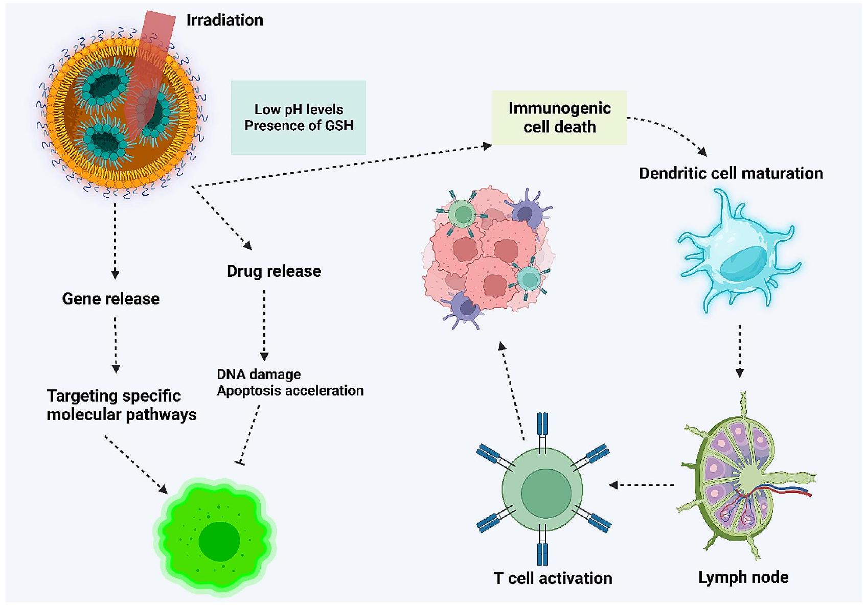 الجسيمات النانوية، من خلال التنظيم المستهدف لخلايا T، ظهرت كمسار واعد لعلاج السرطان المناعي الفعال [282-288]. زيادة تسللالخلايا وخلايا T المساعدة في البيئة المجهرية للورم (TME) أمر حاسم لإعادة تشكيل TME وتنشيط الجهاز المناعي ضد تقدم السرطان. تلعب الجسيمات النانوية مثل هياكل كبريتيد الزنك والمنغنيز النانوية دورًا محوريًا في وساطة هذا التأثير [289]. تتضمن الاتجاهات الملحوظة في السنوات الأخيرة دمج العلاج المناعي مع أساليب علاجية أخرى مثل العلاج الكيميائي أو العلاج الضوئي. تحفز حوامل الأدوية الهجينة التي تحمل سيسبلاتين وكامبتوثيسين محور cGAS/STING وتسبب تلفًا في الحمض النووي. بالإضافة إلى ذلك، تعزز هذه الحوامل للأدوية الهجينةتسلل الخلايا في البيئة المجهرية للورم، مما يحسن نتائج العلاج المناعي لسرطان القولون والمستقيم. تمتلك هذه الحاملات النانوية الهجينة خاصية استجابة للجذور الحرة للأكسجين (ROS) وهي مصنوعة من mPEG2k-DSPE ومواد بوليمرية أخرى [290]. يمكن لحاملات النانو mPEG/PLGA/PLL، التي توصل CD155-siRNA والمعدلة بأجسام مضادة لـ PD-L1، أن تثبط في الوقت نفسه CD155 وPD-L1، مما يتجنب التهرب المناعي. إنها تعززتسلل الخلايا وتحفيز موت الخلايا المناعية في علاج سرطان الثدي [291].