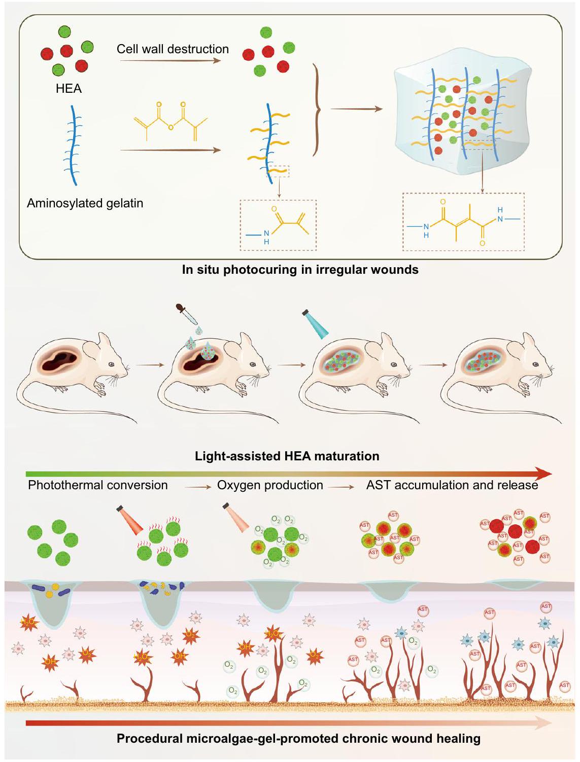تشكل الجروح المزمنة لدى مرضى السكري تهديدًا خطيرًا لحياة الإنسان وصحته. إن علاج الجروح المصابة لدى مرضى السكري هو إجراء معقد للغاية يتضمن العدوى البكتيرية، ونقص الأكسجين، وزيادة التعبير عن ROS، والالتهاب، من بين عوامل أخرى. هناك حاجة ماسة لاستراتيجية علاجية بسيطة وفعالة. إن الجمع بين العلاجات الميكروبية متعددة الوظائف والهلامات المتوافقة حيويًا يحمل وعدًا كبيرًا لعلاج جروح السكري. نظرًا لكفاءتها العالية في إنتاج الأكسجين وإفراز AST، ظهرت HEA كأكثر الكائنات الدقيقة قيمة لعلاج جروح السكري. ومع ذلك، لم يتم التحقيق بعد في استراتيجيات تعتمد على HEA الحية.