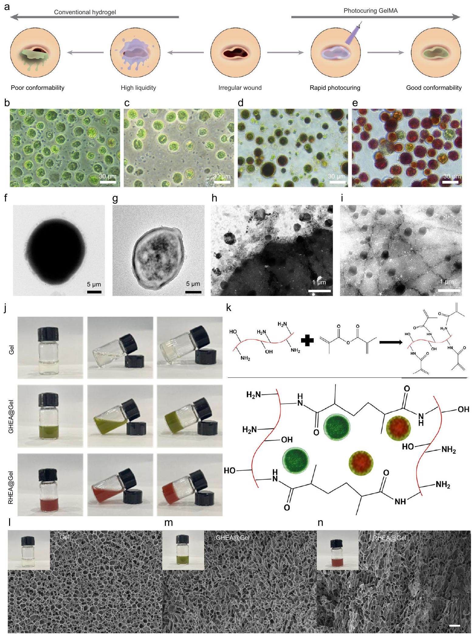 هنا، نقوم بتطوير هيدروجيل بسيط عن طريق احتواء خلايا HEA النشطة في هلام GelMA التقليدي ونؤسس نظامًا للعلاج الإجرائي المحلي (الشكل 1). لزيادة كفاءة إطلاق الأكسجين وAST، يتم أولاً تحضير كريات HEA، وتحميلها بمحلول GelMA، وتثبيتها ضوئيًا في الموقع لتأسيس جروح غير منتظمة بشكل أفضل. وفقًا لكثافة طاقة الضوء، يتوسط وفرة الكلوروفيل الانتقال بين إنتاج الأكسجين عبر عملية التمثيل الضوئي وإنتاج الحرارة عبر تأثير التحويل الضوئي الحراري في خلايا HEA الخضراء (GHEA). لذلك، في المرحلة الأولية من العلاج، يحدث تحويل ضوئي حراري فعال تحت إشعاع ليزر 658 نانومتر مع يمكن أن تقضي كثافة الطاقة بسرعة على البكتيريا. في المرحلة الثانية من العلاج، يتم حل نقص الأكسجين الشديد في الجرح من خلال توفير إمداد مستمر من الأكسجين لعملية التمثيل الضوئي تحت إشعاع ليزر 658 نانومتر معكثافة الطاقة. مع تدهور بيئة الثقافة (المربوطة في الهيدروجيل) أو التحفيز الخارجي (إشعاع الليزر)، تتراكم AST تدريجياً، مما يحول خلايا HEA إلى اللون الأحمر (RHEA) ويمنحها قدرة قوية على تعديل بيئة الجرح الدقيقة. بعد ذلك، تطلق خلايا HEA بشكل روتيني