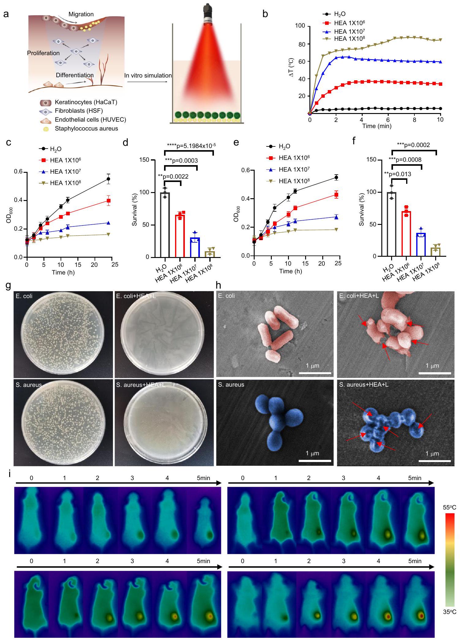 نظرًا للتعرض المستمر لجروح DU للبيئة الخارجية، هناك خطر كبير من العدوى البكتيرية الخارجية وتأخر شفاء الجروح بشكل كبير. كما تم الإبلاغ سابقًا , تتفاعل أنواع مختلفة من الكائنات الدقيقة مع بعضها البعض لتثبيط نمو بعضها البعض في حالة عدم التعايش، مما يساهم في النشاط المضاد للبكتيريا للجروح. للتحقق من تأثير عدم التعايش لعلاج الدمج، تم قياس تكاثر الإشريكية القولونية (E. coli) والمكورات العنقودية الذهبية (S. aureus) بعد الزراعة المشتركة مع GHEA دون التعرض للأشعة الضوئية. كما هو موضح في الشكل التكميلي 5، لوحظ تثبيط واضح لنمو البكتيريا لكل من E. coli وS. aureus، حيث ظلت معدلات بقاء E. coli وS. aureus، على التوالي، عند و، على التوالي، عندما وصلت كثافة خلايا GHEA إلى . بالإضافة إلى ذلك، نظرًا لإمكانية التحويل الضوئي الحراري لخلايا HEA، قمنا بتقييم النشاط المضاد للبكتيريا في المختبر لـ GHEA من خلال تقييم التأثير الضوئي الحراري تحت إشعاع ليزر 658 نانومتر (الشكل 3a). كما هو موضح في الشكل 3b، كان التأثير الضوئي الحراري لـ HEA@Gel متناسبًا مع كثافة خلايا HEA. زادت درجة حرارة الماء فقط بمقدار تحت إشعاع ليزر 658 نانومتر.