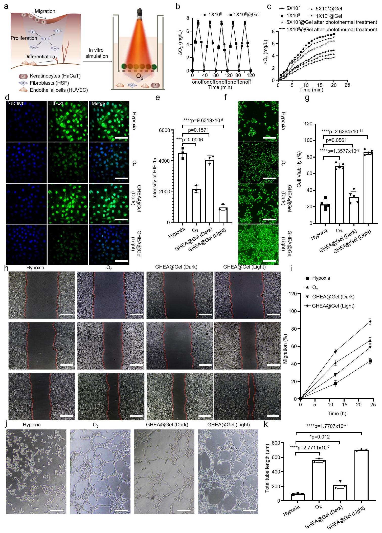 by releasing dissolved oxygen to promote HSF proliferation. In addition, GHEA@Gel promoted cell proliferation in HUVECs and HaCaTs (Supplementary Figs. 15, 16). Scratch healing of keratinocytes is ideally the core of re-epithelialization processes during chronic wound healing. In the scratch test, we compared cell migration under hypoxic conditions, supply conditions, and soluble oxygen generated by GHEA@Gel under light irradiation. Fig. 4h, i show that, compared with an supply, a hypoxic environment significantly inhibited the migration of HaCaT cells. Notably, coculturing cells with GHEA@Gel in a hypoxic environment and subsequent exposure to light significantly increased the migration rate of the cells, indicating that the soluble oxygen produced by GHEA@Gel could promote epithelialization, thus facilitating chronic wound healing. Endothelial cells are an integral part of blood vessels and play a crucial role in vascularization. We performed tube formation tests using microscopy. The Matrigel tube formation assay, performed to assess angiogenic capacity, revealed a significantly greater tube length and number of branches after 6 h in the GHEA@Gel-treated HUVECs than in the -treated HUVECs (Fig. 4j, k). The results of a series of in vitro assays confirmed that the increase in angiogenesis was caused by the soluble oxygen produced by the GHEA@Gel.