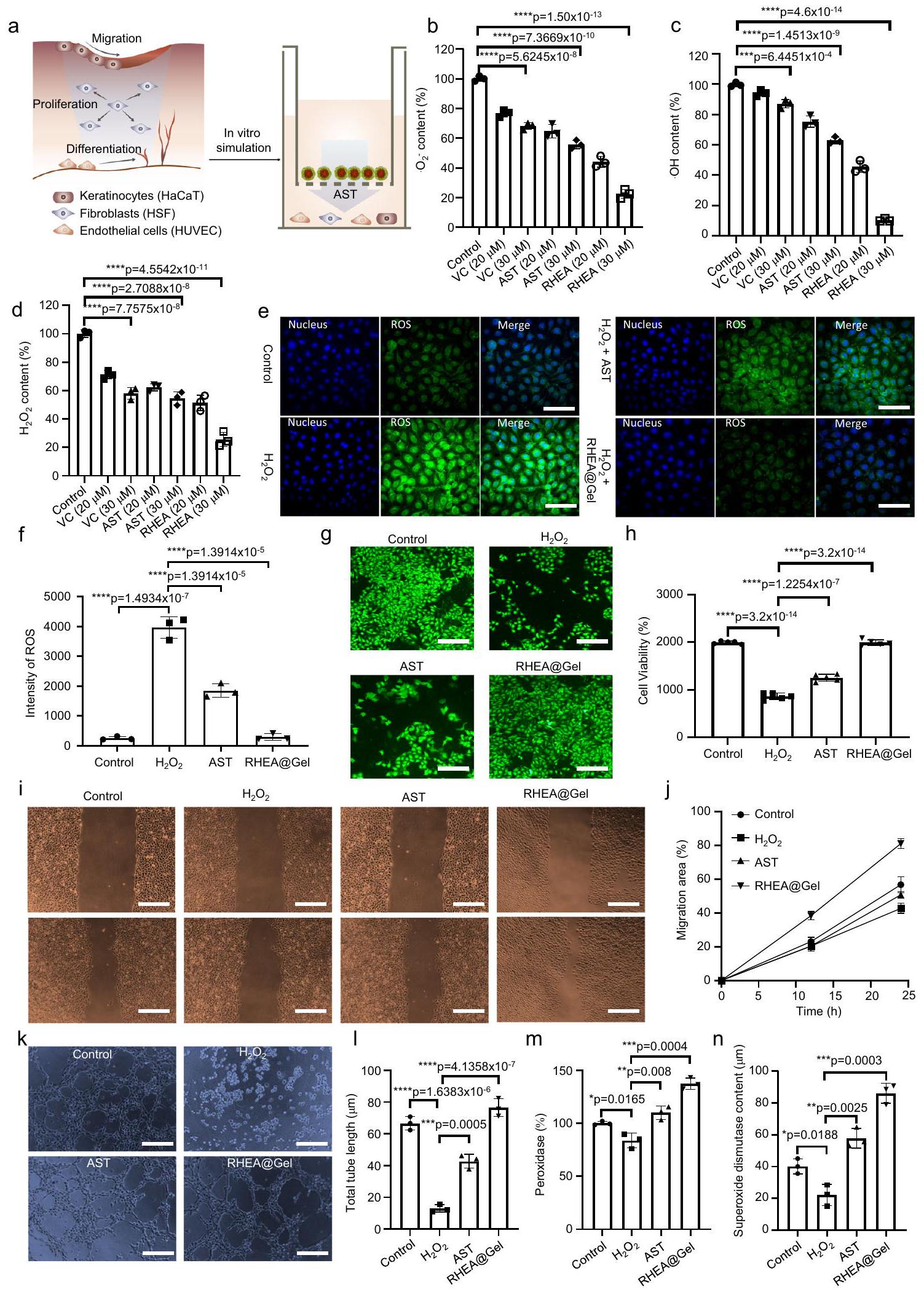 استنادًا إلى هذه النتائج، تم التحقيق بشكل أكبر في تأثير RHEA@Gel على تكاثر HSF، وقد أدى RHEA@Gel إلى زيادة كبيرة في معدل التكاثر في HSFs مقارنةً بـ و AST (الشكل 5g، h)، مما يشير إلى أن AST المفرج عنه من RHEA@Gel لديه إمكانيات كبيرة لتشكيل نسيج حبيبي من خلال تعزيز تكاثر HSF. بالإضافة إلى ذلك، تم ملاحظة قدرة RHEA@Gel على تعزيز تكاثر الخلايا أيضًا بالنسبة لـ HUVECs و HaCaTs (الأشكال التكميلية 19، 20). بعد ذلك، قمنا بفحص تأثير AST من RHEA@Gel على خلايا HaCaT المستحثة بواسطة ROS. حيث أن ROS قد أوقف بشكل كبير هجرة خلايا HaCaT، بينما زادت تحفيزات RHEA@Gel بشكل كبير من هجرة خلايا HaCaT (الشكل 5i، j). كان لـ RHEA@Gel و AST تأثيرات كبيرة على هجرة الخلايا. قمنا بإجراء اختبارات تشكيل الأنابيب باستخدام المجهر. أظهر اختبار تشكيل الأنابيب باستخدام Matrigel، الذي تم إجراؤه لتقييم القدرة على تكوين الأوعية، طول أنبوب أكبر وعدد أكبر من الفروع بعد 6 ساعات في HUVECs المعالجة بـ RHEA@Gel مقارنة بـ HUVECs المعالجة بـ AST (الشكل 5k، l). بالإضافة إلى ذلك، اكتشفنا أن AST المفرج عنه من RHEA@Gel يمكن أن يزيد من تعبير البيروكسيداز و SOD في الخلايا، مما يساعد في التخلص من ROS داخل الخلايا. تشير هذه النتائج إلى أن الزيادة في تكوين الأوعية التي لوحظت في سلسلة من الاختبارات في المختبر كانت نتيجة لإفراز AST من RHEA@Gel.