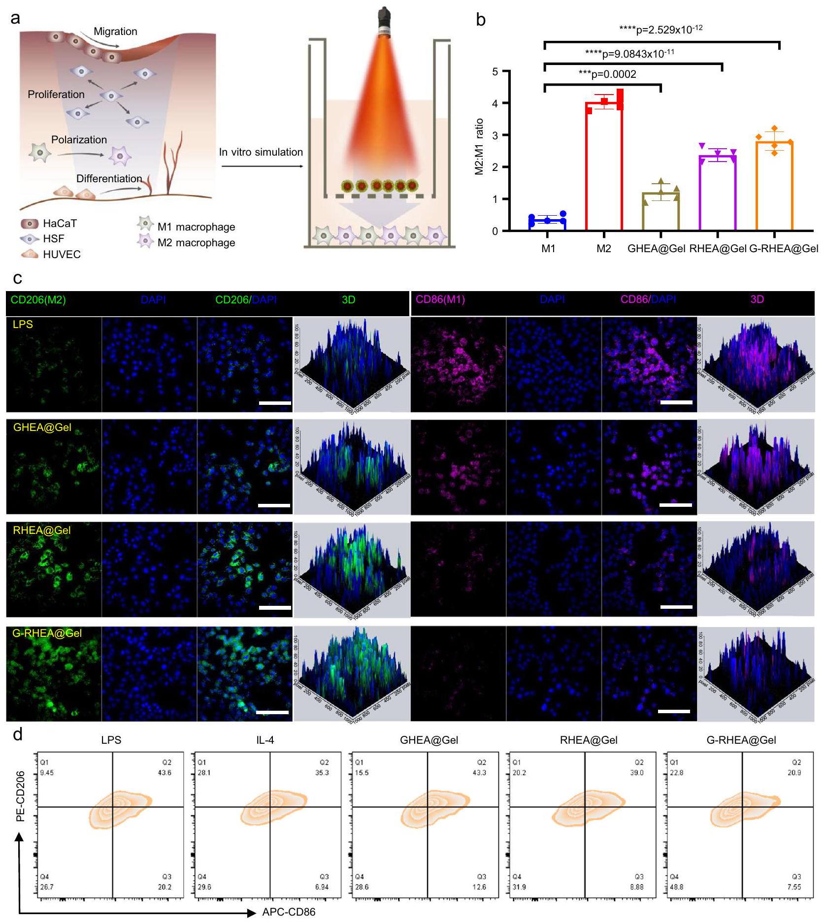 التأثير المضاد للالتهابات لـ LPS + IFN- أو IL-4 تم تقييمه في نموذج البلعميات. تم زرع البلعميات في الحجرة السفلية من لوحة ترانسويل ذات 24 بئرًا (كل بئر يحتوي على الخلايا) لمدة 12 ساعة. خلال زراعة البلعميات، LPS و إنترفيرونتمت إضافة إلى وسط الثقافة، بعد ذلك تم زراعة الخلايا لمدة 12 ساعة. بعد ذلك، تم إضافة GHEA@Gel أو RHEA@Gel أو G-RHEA@Gel إلى وسط الثقافة، وتم السماح للخلايا بالنمو. لمدة 24 ساعة. تم تثبيت البلعميات بـبارافورمالدهيد. ثم تم إجراء صبغ المناعية الفلورية وتحليل FCM لـ CD206 و CD86. خلال هذه العملية، تم حضن البلعميات معأدى IL-4 إلى تحفيز النمط الظاهري M2 كتحكم.