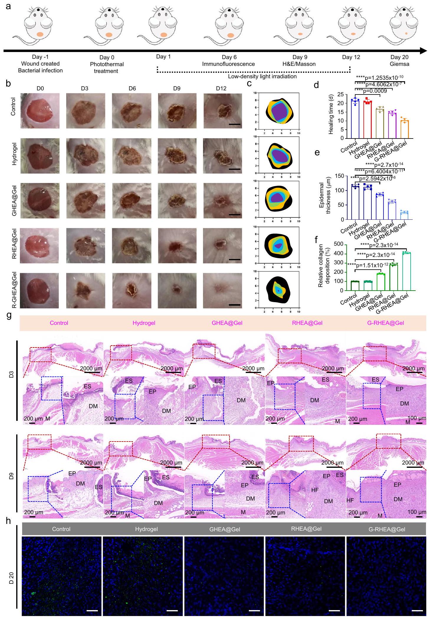يتم تصوير النهج العلاجي في الشكل 7أ. الاستفادة من تأثير التحويل الضوئي الحراري لـ HEA@Gel تحت إشعاع ليزر بزاوية 658 نانومتر عند كثافة وتأثير عدم التعايش بين HEA و S. aureus، تم تعقيم الجرح المصاب بالسكري أولاً. بعد العلاج القاتل للبكتيريا، تم استخدام ليزر بطول موجي 658 نانومتر لإضاءة الجرح كل يوم لاحق عند شدة ضوء لمدة 30 دقيقة في الأيام العشرة التالية. للإشعاع بالليزر منخفض الكثافة تأثيران. أولاً، يقوم GHEA بتنشيط عملية التمثيل الضوئي لإنتاج لتحسين البيئة الميكروية للجروح الناجمة عن نقص الأكسجين وتسريع تجديد الأوعية الدموية وشفاء الجروح. والثاني هو تعزيز إطلاق AST من RHEA لتقليل مستويات ROS والعوامل الالتهابية المفرطة التعبير وتنظيم استقطاب البلعميات M2 في الجروح. ومن ثم، من المحتمل أن يكون HEA@Gel قد عزز تكاثر الخلايا الليفية، وهجرة الخلايا الكيراتينية، وتمايز الخلايا البطانية، والتسريع التدريجي لشفاء الجروح المصابة لدى مرضى السكري.
