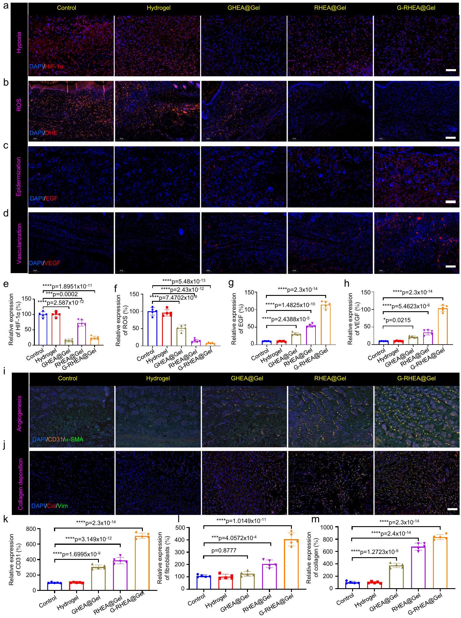 لإظهار فعالية HEA@Gel، تم فحص قدرة GHEA على تعزيز شفاء الجروح من خلال HIF-1تلطيخ المناعة الفلورية. بالنسبة لمجموعتي التحكم والهلام، كان هناك HIF-1 كبيرتم ملاحظة التعبير. بسبب عملية التمثيل الضوئي الفعالة لـ GHEA، فإن HIF-1كان مستوى GHEA@Gel أقل بكثير من المستوى في مجموعة التحكم، مما يشير إلى إمداد أكسجين أكبر بشكل ملحوظ (الشكل 8a، e). بالمقارنة مع أولئك في مجموعة GHEA@Gel، كان إمداد الأكسجين في مجموعة RHEA@Gel أقل بسبب تراكم AST العالي وتقليل عملية التمثيل الضوئي. تقريبًا لا يوجد HIF-1تم الكشف عن التعبير في