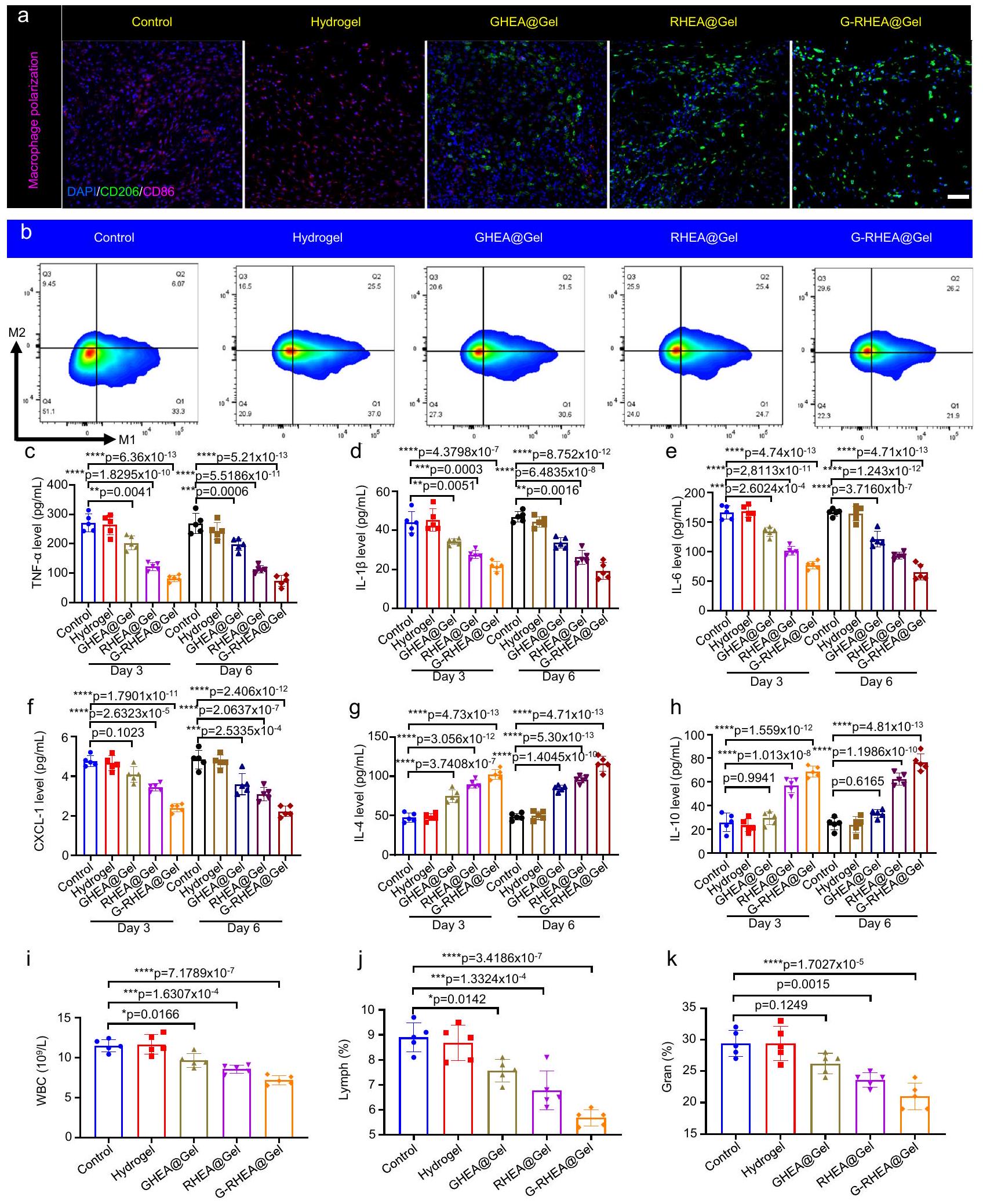 In the process of wound healing, macrophages play a critical role. The in vivo M2/M1 macrophage ratio was confirmed by immunofluorescence staining for CD206 and CD86 (Fig. 9a). Higher populations of M2 macrophages and lower populations of M1 macrophages were detected in the GHEA@Gel and RHEA@Gel groups, which resulted in a greater M2/M1 macrophage ratio (Supplementary Fig. 24), demonstrating decreased proinflammatory and enhanced antiinflammatory capacities. In particular, the G-RHEA@Gel group displayed the highest anti-inflammatory capacity, which was attributed to the combined antibacterial, oxygen supply, ROS scavenging, and antiinflammatory actions of GHEA and RHEA. CD206 (M2 macrophages) and (M1 macrophages) cells were quantified by flow cytometry, and the results were consistent with the immunofluorescence images (Fig. 9b and Supplementary Fig. 25). Nuclear factor-кB (NF-кB) is the central signaling pathway regulating inflammation by mediating the expression of downstream proinflammatory cytokines, including TNF, IL-6, and IL-1 , which further impedes tissue recovery. Neutrophils are the predominant effector cells in bacterial infections, and they persistently accumulate in diabetic wounds, thereby retarding the healing process. CXCL-1, a member of the CXC chemokine family, is involved in the migration and activation of neutrophils. At days 3 and 6 , the IL- , IL- 6 , TNF- and CXCL- 1 levels in the wounds were reduced in all the gel groups (Fig. 9c-f). The G-RHEA@Gel group exhibited marked decreases in the levels of IL- , IL- 6 , TNF- and CXCL- 1 compared with those in the other groups, indicating the good effectiveness of the combination treatment in alleviating inflammation. In contrast, IL-4 and IL-10 are regeneration-promoting cytokines that facilitate tissue repair, wound healing, axonal regeneration, and M2 macrophage polarization. The G-RHEA@Gel group expressed the highest levels of IL-4 and IL-10 among all the gel groups compared to those in the control group, indicating a remarkable pro-regenerative effect (Fig. ). On day 3 following treatment, the white blood cell (WBC) count, lymphocyte (Lymph) count, and neutrophil percentage (Gran) in the peripheral blood of the GHEA@Gel, RHEA@Gel, and GRHEA@Gel groups were significantly lower than those in the control