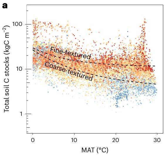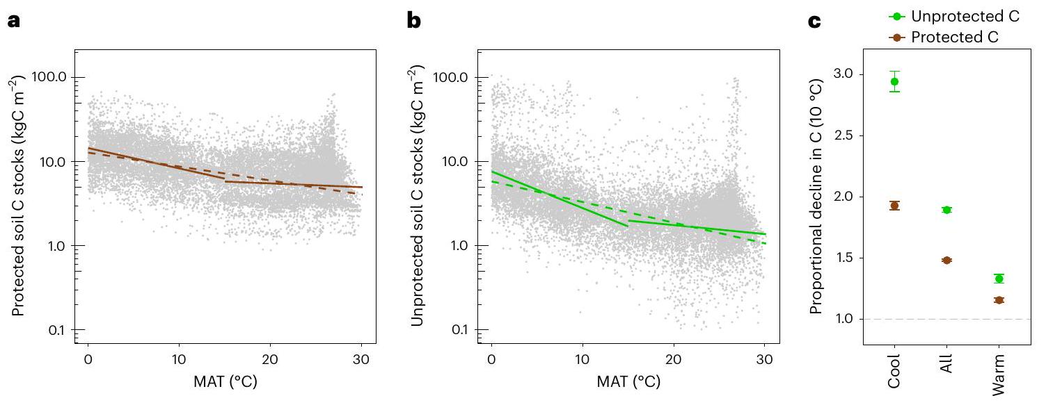 التربة التي تحتوي على مخزونات كربون غير محمية أعلى تؤدي إلى حساسية أكبر لدرجة الحرارة. تظهر حساسية درجة الحرارة المناخية لكربون التربة الكلي من توزيعات المخزونات الأساسية واعتمادياتها على درجة الحرارة.
