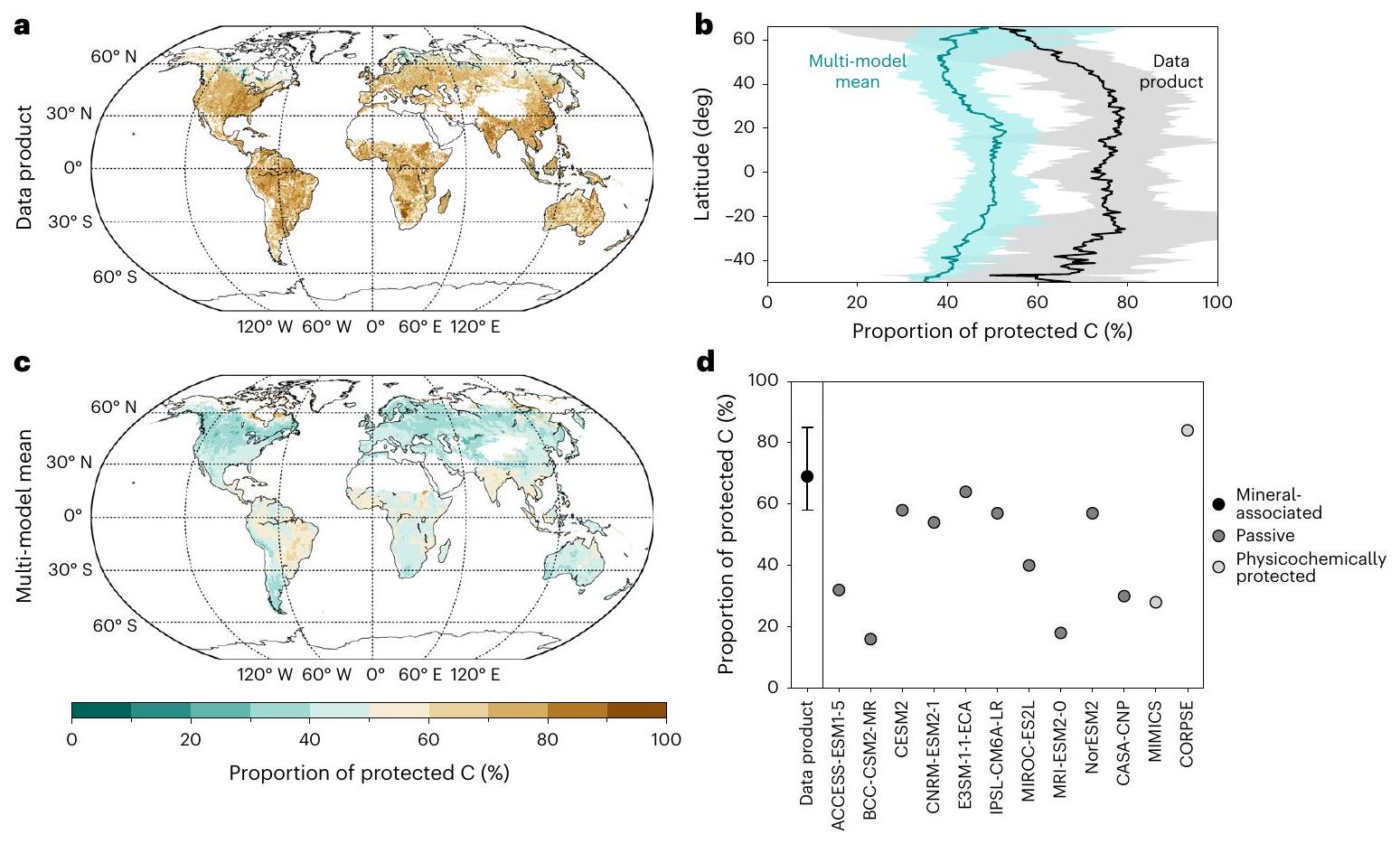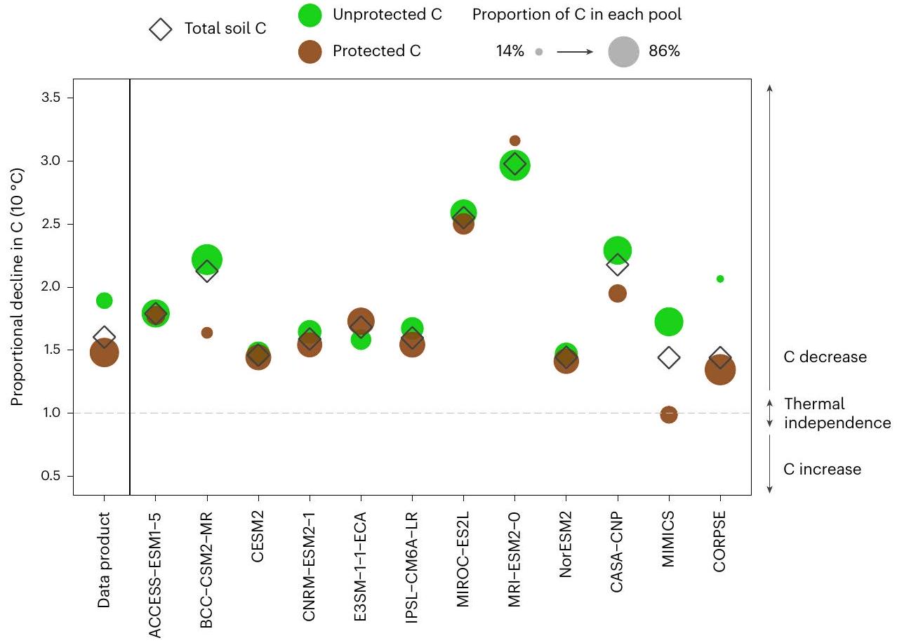 قد تبدو بعض النماذج قادرة على التقاط حساسية درجة الحرارة المناخية المستمدة من الملاحظات لكتل الكربون في التربة، لكن هذا الاتفاق لا يحدث دائمًا للأسباب الصحيحة وقد ينهار عند النظر في مساهمة خزانات الكربون في التربة المحمية وغير المحمية. على سبيل المثال، ستة من نماذج CMIP6 ESMs (ACCESS-ESM1-5، CESM2، CNRM-ESM2-1، E3SM-1-1-ECA، IPSL-CM6A-LR وNorESM2) ونموذجان محددان ميكروبيًا (MIMICS وCORPSE) تلتقط تقريبًا حساسية درجة الحرارة لكتل الكربون في التربة (الشكل 4 والجدول التكميلي 6). ومع ذلك، تظهر هذه النماذج نفسها توزيعات متباينة وحساسيات درجة حرارة مناخية لخزانات الكربون في التربة المحمية وغير المحمية (الشكل 4). فقط عدد قليل من النماذج تلتقط تقريبًا حساسية درجة الحرارة المناخية للكربون المحمي (CESM2، CNRM-ESM2-1، IPSL-CM6A-LR، NorESM2 وCORPSE) وأقل منها للكربون غير المحمي (ACCESS-ESM1-5، MIMICS وCORPSE).