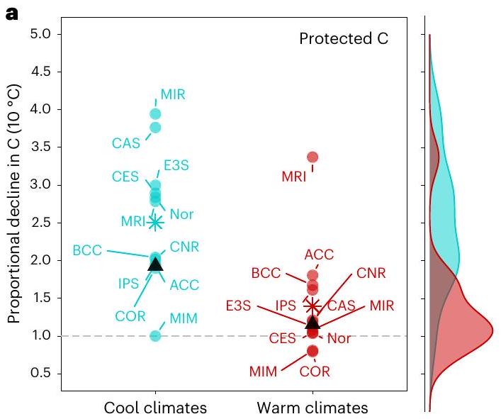 both cool and warm climates, and of both C pools in warm climates (Fig. 5). This is especially true of MIROC-ES2L, CASA-CNP and MRI-ESM2-0, which overestimate the climatological sensitivity of protected