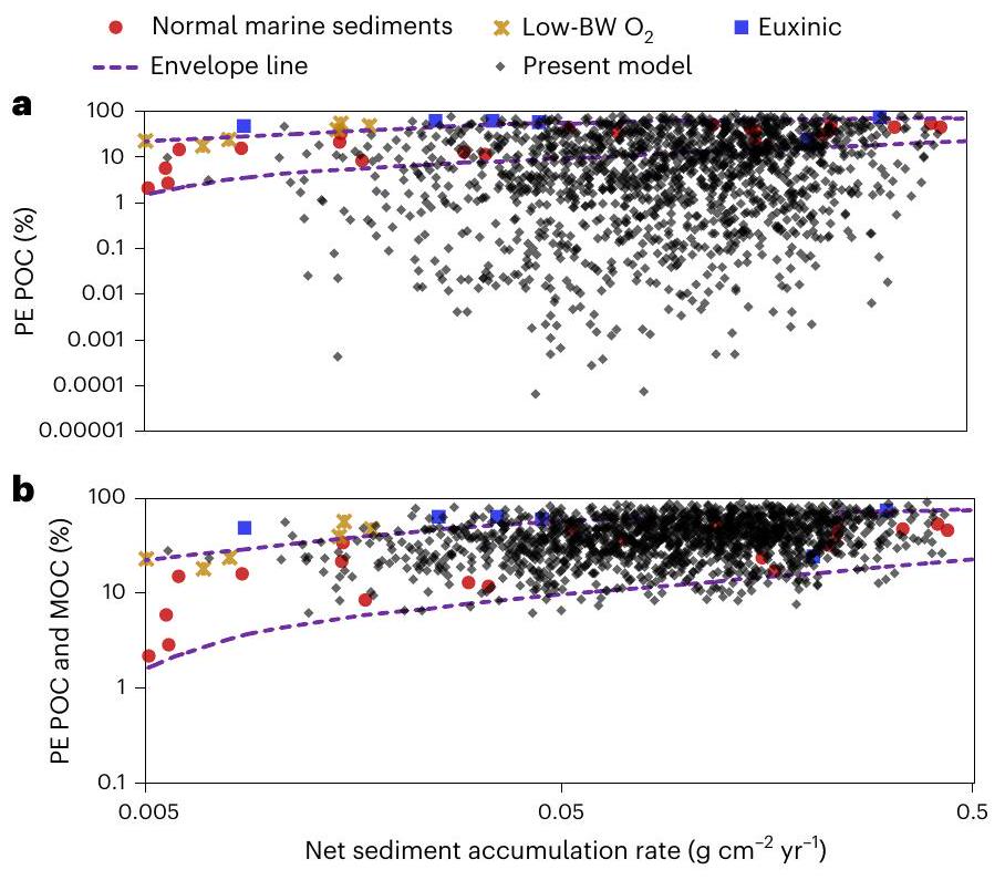 الذي يأخذ في الاعتبار فقط POC في الشكل 2 (المراجع 12، 36). لا يمكن أن يفسر PE لـ POC وحده الاتجاه الملحوظ وغلاف قيم PE مقابل معدل تراكم الرواسب (الشكل 2 أ، الخطوط المنقطة)