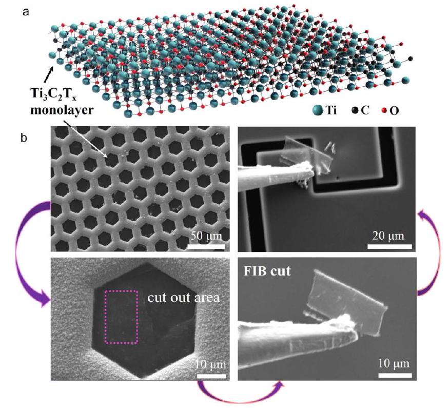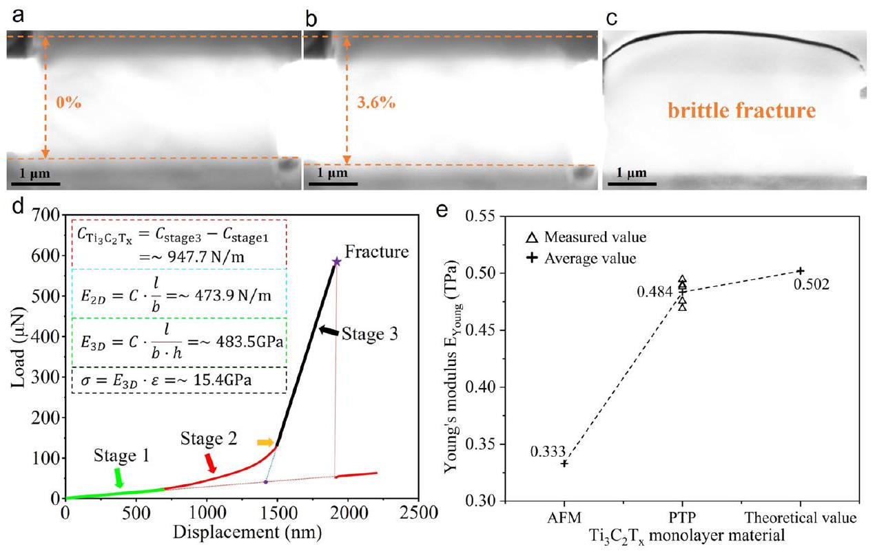 MXene are unchanged, and the comparison of experimental results confirms that the Pt deposition didn’t exert a significant impact on the test. During the FIB cutting process, we set a minimum current of 1 pA to minimize the edge defect concentration. As can be seen from Supplementary Fig. 6a-c, the effect of