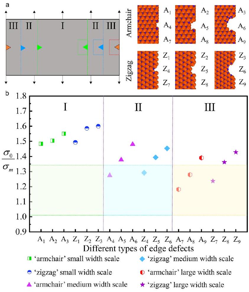 , respectively. The boundary conditions were periodic, along the armchair and zigzag directions, respectively. All three atomic defects were set at the edge of the sample. A uniform uniaxial tensile strain was applied at a loading rate of