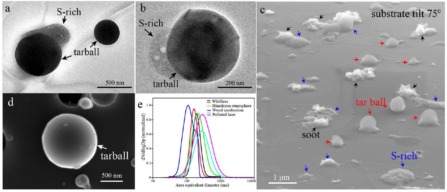 (SEM) collected in suburban air. e Size distributions of tar ball particles collected in wildfires