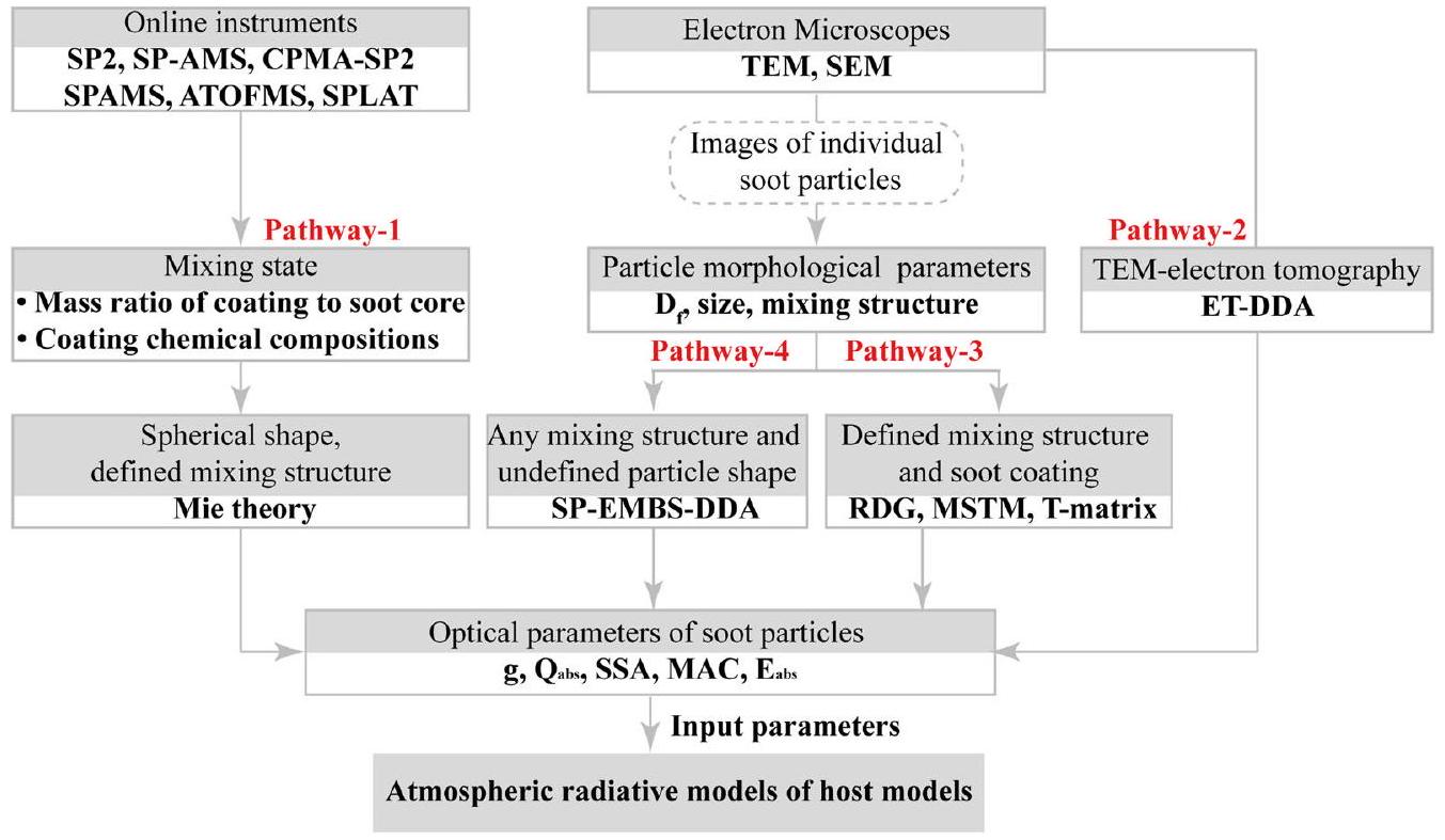 absorption of soot and BrC. (3) Beyond the microphysical property of lightabsorbing particles, their chemical composition, particularly BrC undergoes continuous changes due to atmospheric ageing or variations arising from different formation pathways and sources. (4) Improved optical models of realistic mixing structures are required to accurately predict the optical properties of aged soot and organic particles, particularly those exhibiting complex mixing structures and morphologies. The implementation of these advanced techniques can significantly decrease the computation time and facilitate the creation of extensive optical database for climate models