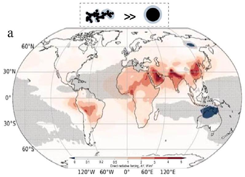 امتصاص السخام وBrC. (3) بالإضافة إلى الخصائص الميكروفزيائية للجسيمات الممتصة للضوء، فإن تركيبها الكيميائي، وخاصة BrC، يخضع لتغيرات مستمرة بسبب شيخوخة الغلاف الجوي أو التغيرات الناجمة عن مسارات التكوين المختلفة والمصادر. (4) هناك حاجة إلى نماذج بصرية محسّنة لهياكل الخلط الواقعية للتنبؤ بدقة بالخصائص البصرية للسخام العضوي والجسيمات العضوية المتقدمة، وخاصة تلك التي تظهر هياكل مختلطة معقدة وأشكال. يمكن أن يؤدي تنفيذ هذه التقنيات المتقدمة إلى تقليل وقت الحساب بشكل كبير وتسهيل إنشاء قاعدة بيانات بصرية واسعة لنماذج المناخ.