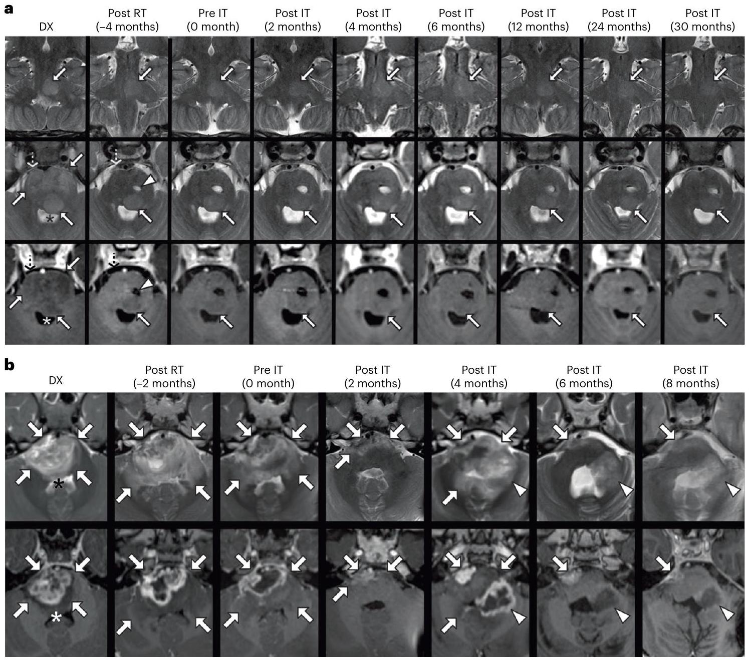 تجاربنا السريرية المرحلة الأولى التي تقدم خلايا CAR T داخل الجمجمة (BrainChild-01 التي تقدم مستقبل عامل نمو البشرة البشري 2) خلايا CAR T المستهدفة لـ (HER2) (NCT03500991); BrainChild-02 توصيل خلايا CAR T الخاصة بـ EGFR806 (NCT03638167) استبعد المرضى الذين يعانون من DIPG. حيث يتم التعبير عن B7-H3 (CD276) في DIPGقمنا بتصميم خلايا CAR T المستهدفة لبروتين B7-H3 (خلايا CAR T لبروتين B7-H3) ووصفنا فعاليتها قبل السريرية.. بعد ذلك، قمنا بفتح الدراسة BrainChild-03 (NCT04185038)، حيث تم توصيل خلايا CAR T من نوع B7-H3 للأطفال الذين يعانون من أورام الجهاز العصبي المركزي المتكررة أو المقاومة والعلاج الإشعاعي للورم الجسدي، ونشرنا نتائج التحمل الأولية..
