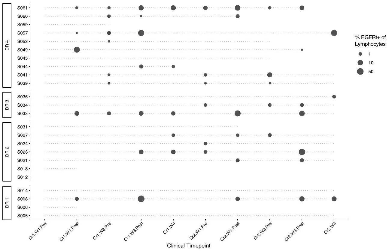 Samples with lymphocytes count under the limit of quantitation (LOQ) requirement for the assay were excluded from reporting. CART cell detection status is determined by a combination of at least one detectable EGFRt+ cell count in the sample, as well as the level of Lymphocytes/EGFRt+% cell in the sample to be above the pre-defined limit of detection (LOD) for the assay.