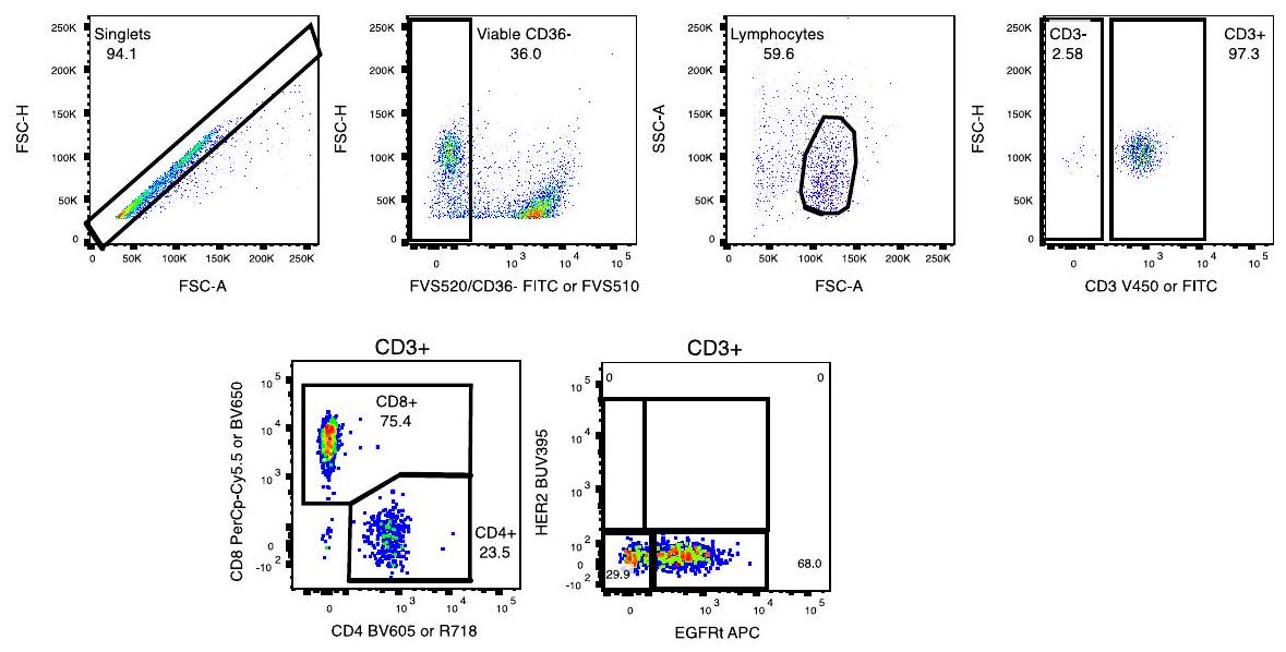 Gating strategy used for flow-based CAR detection in CSF. Selection of the singlet, viable [CD36-] lymphocyte population was performed prior to T cell gating and examination of the EGFRt+ CART cells and CD4/CD8 expression.